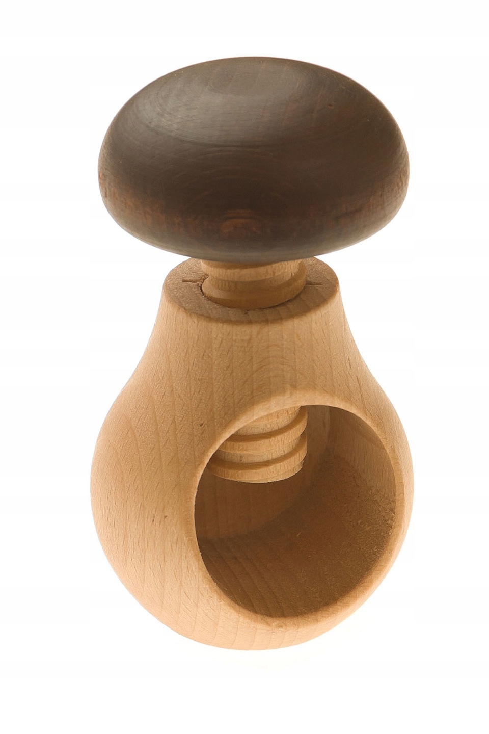 Щелкунчик полностью изготовлен из дерева и выполнен в форме гриба. Имеет толстую резьбу, которая легко справится с самым твердым орехом.