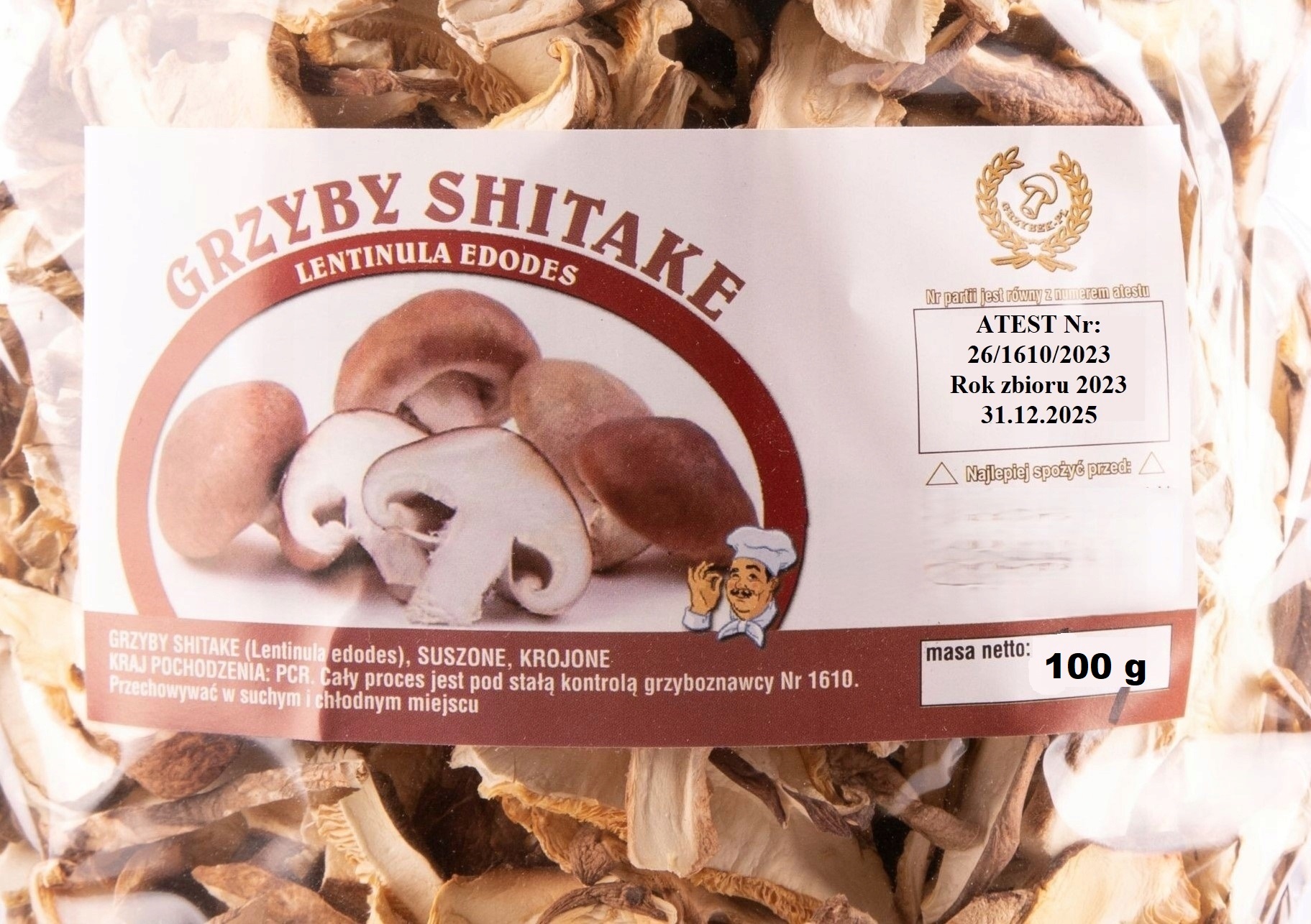 ЭТИКЕТКА ТОВАРА включает СЕРТИФИКАТ с номером грибного эксперта и подтвержденным годом сбора урожая.
