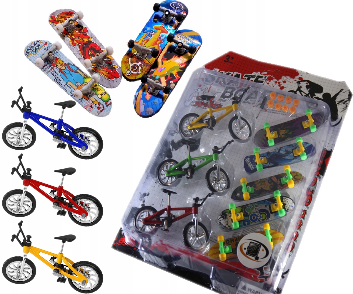В комплект входит мини-скейтборд, называемый фингербордом, в различных исполнениях.