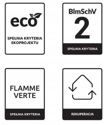 - Экологическое сгорание - соответствует требованиям эко -проекта, Bimschv 2 и 7* Flamme Verte, что переводится на выхлопные выхлопы с низким выбросом.