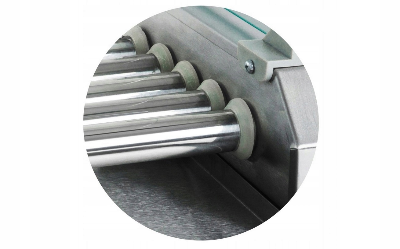Чистая плата управления. Основной переключатель и регуляторы обогревателя 2x 900 Вт !!! обогрев. Ролики (9 штук) изготовлены из нержавеющей стали. Они вращаются на 360 °, благодаря которой колбаски, лежащие между ними, нагревают их равномерно. Температура плавно регулируется до 250 ° С. Колбасы каждый раз подрумяниваются и выглядят аппетитно!
