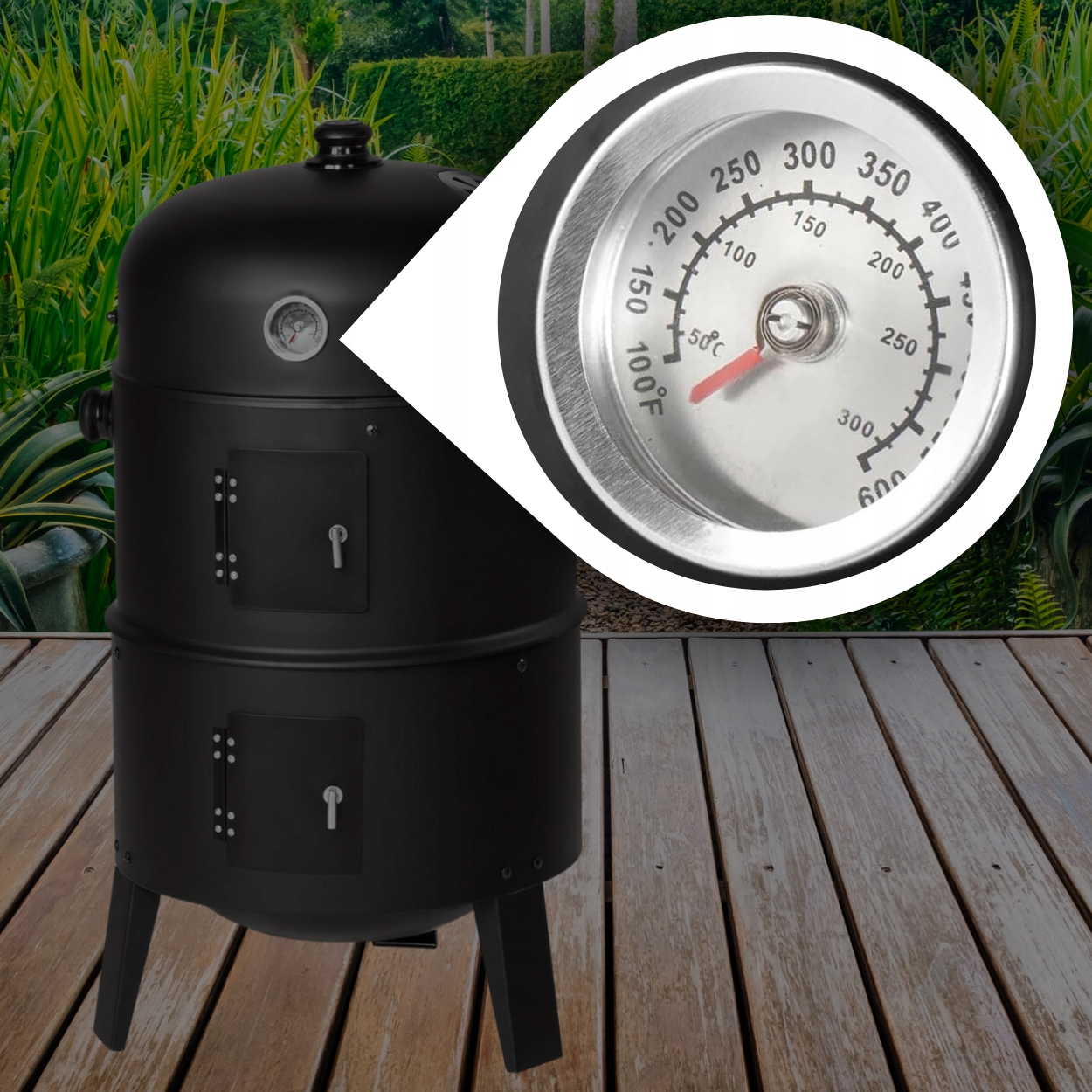 ГРИЛЬ СТАЛЬНАЯ КОПТНИЦА УГОЛЬ САДОВЫЙ ОГОНЬ ДЫМ ТЕРМОМЕТР 3-в-1