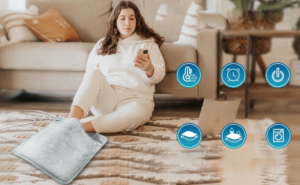🔥 Безопасный для кожи материал: грелки для ног с обеих сторон изготовлены из чрезвычайно мягких микроплюшевых волокон, которые чрезвычайно прочны и согревают. Чрезвычайно мягкие микроплюшевые волокна удерживают тепло в подушке и сохраняют тепло. Чехол коврика с электроподогревом можно стирать в машине, и его легко содержать в чистоте.