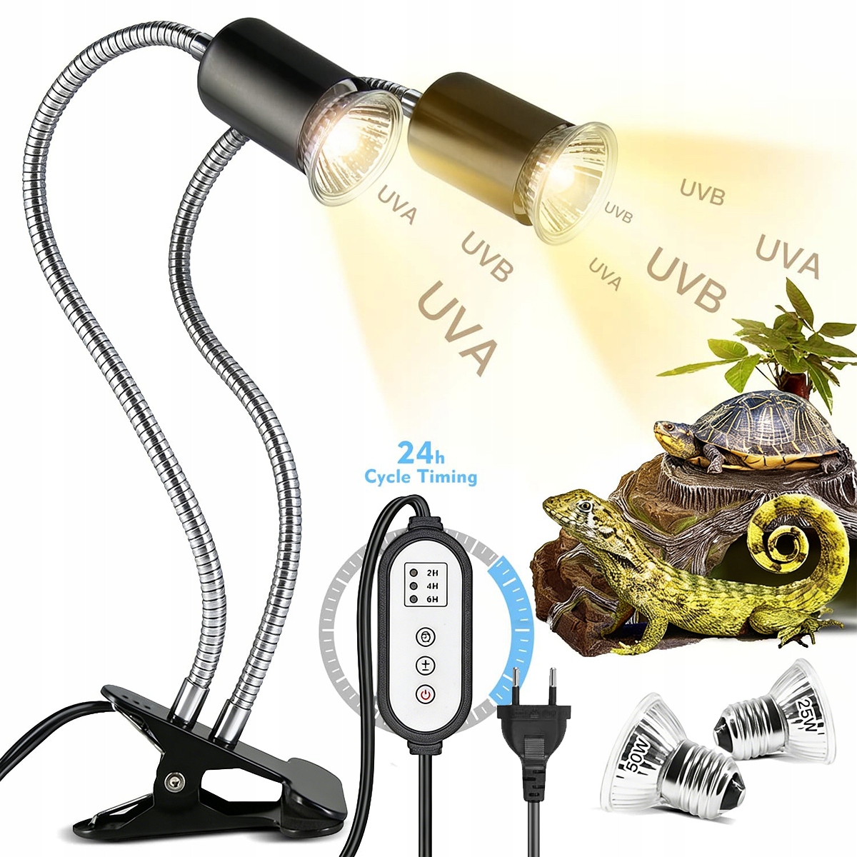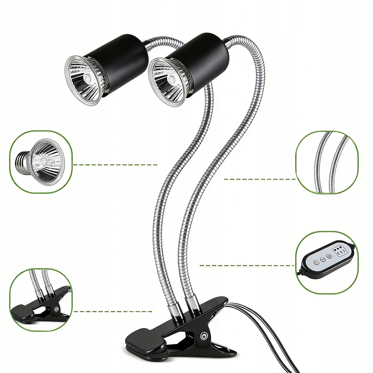 Нагревательная лампа с двойной головкой на гибкой шее, нагревательная лампа с регулируемым временем и зажимом UVA UVB для домашних животных, аквариумных домашних животных, с нагревательной лампой мощностью 25 Вт и 50 Вт