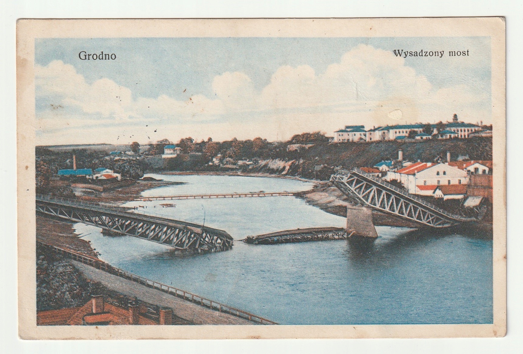 ГРОДНО. Взорванный мост, ХХ век, состояние - небольшой изгиб в правом нижнем углу, из обращения, марка от 14 июля 1916 года.