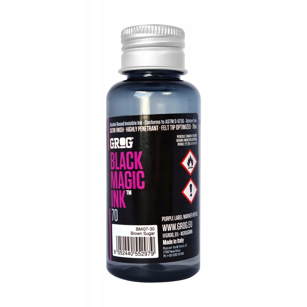 Black Magic Ink 70 — новый секретный рецепт для путешествий по городу. Поставляется в ударопрочном флаконе из темного пластика. Black Magic Ink 70 содержит 70 мл невидимых чернил на спиртовой и водной основе, оптимизированных для маркеров CUTTER, которые реагируют только под воздействием ультрафиолета, пока не приобретут темно-коричневое сатиновое покрытие. Идеально подходят для работы в помещении и на открытом воздухе.