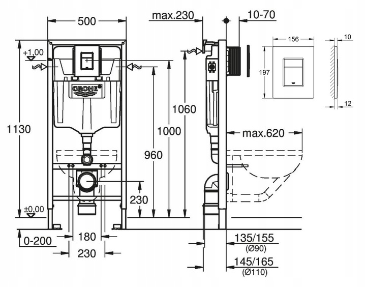 Рамка GROHE для скрытого монтажа, черная кнопка + унитаз Deante без оправы БЕЗ СИДЕНЬЯ