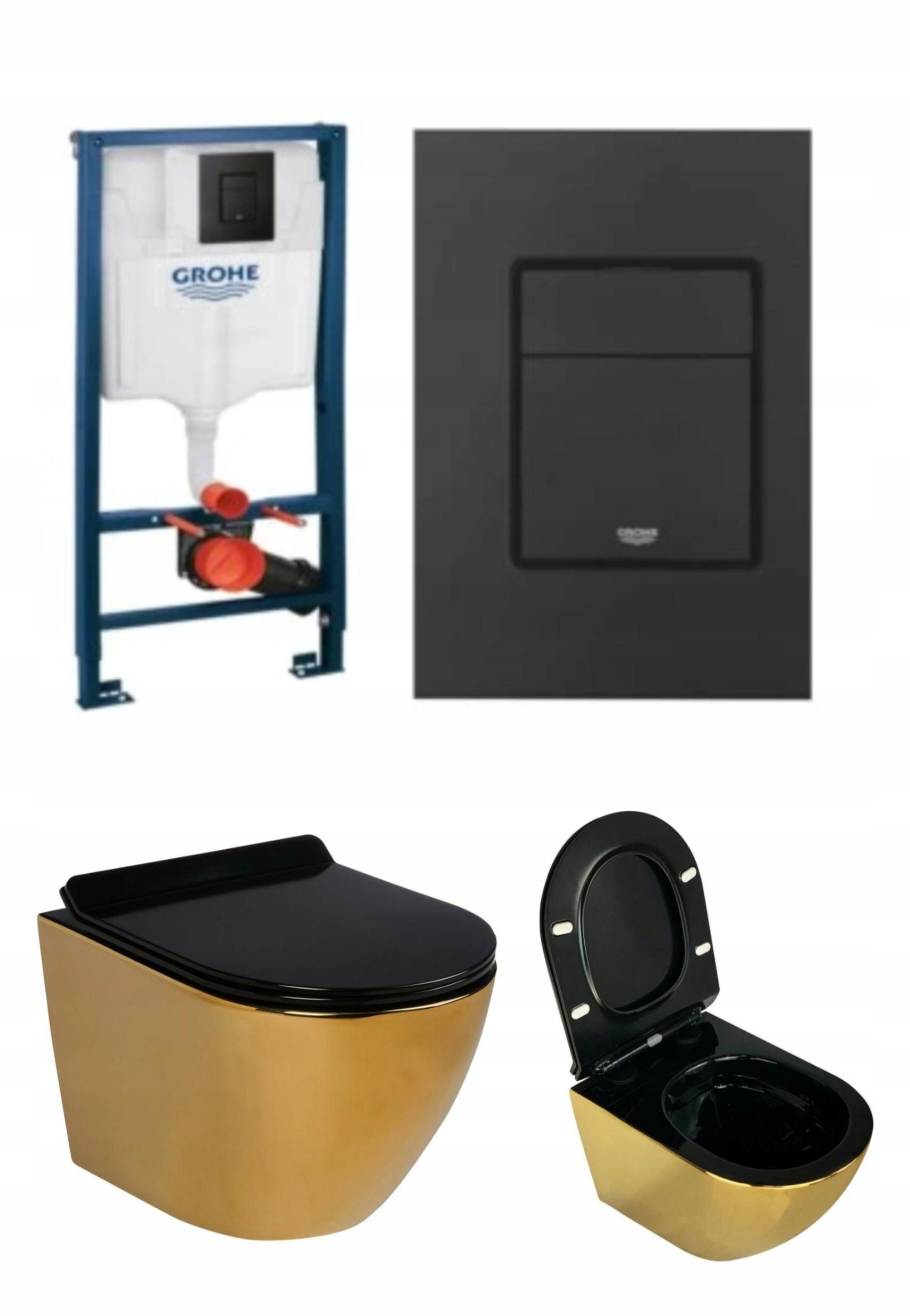 ПОЛНЫЙ КОМПЛЕКТ НАБОРА ДЛЯ УНИТАЗА GROHE SOLIDO С ЧЕРНОЙ КНОПКОЙ SKATE И ПОДВЕСНОЙ ЧАШОЙ БЕЗ ОБРАТКИ ЗОЛОТОГО ДОМИНО С МЕДЛЕННО ЗАКРЫВАЮЩИМСЯ СИДЕНЬЕМ из ДЮРОПЛАСТА.