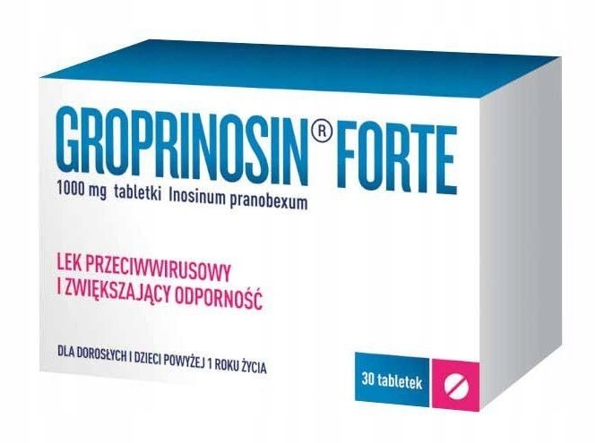 Таблетки Гроприносин Форте – противовирусный препарат, который также стимулирует иммунную систему. Действующим веществом препарата является инозин пранобекс, который подавляет размножение патогенных вирусов группы герпеса in vitro. Гроприносин Форте применяют в случаях снижения иммунитета, при рецидивирующих инфекциях верхних дыхательных путей, а также у лиц, у которых диагностирован вирус простого герпеса при его появлении на губах или коже. Лекарственное средство предназначено для людей старше 1 года.