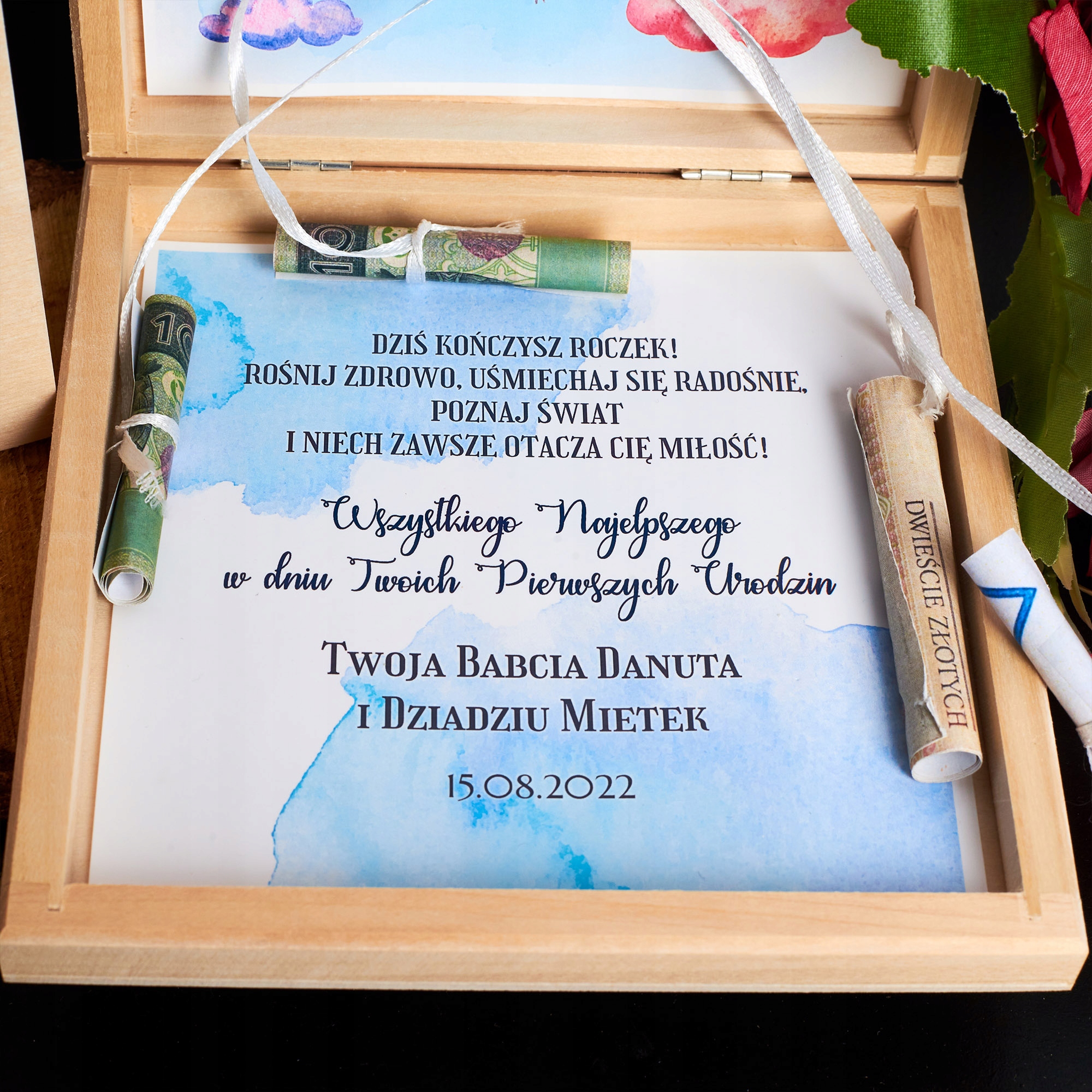 Уникальная и неповторимая коробочка, в которой находятся деньги на веревочке! Это оригинальный подарок как для мальчиков, так и для девочек, достигающих первого года жизни. Это будет незабываемый и долговечный подарок, идеально подходящий для такого важного случая. Оно, безусловно, прекрасно отразит уникальный характер этого мероприятия. На крышке коробкигравировка, внутри два листа бумаги. Один с пожеланиями для ребенка , а другой с изображением воздушных шаров с прикрепленной лентой, к которой можно привязать скрученные деньги.