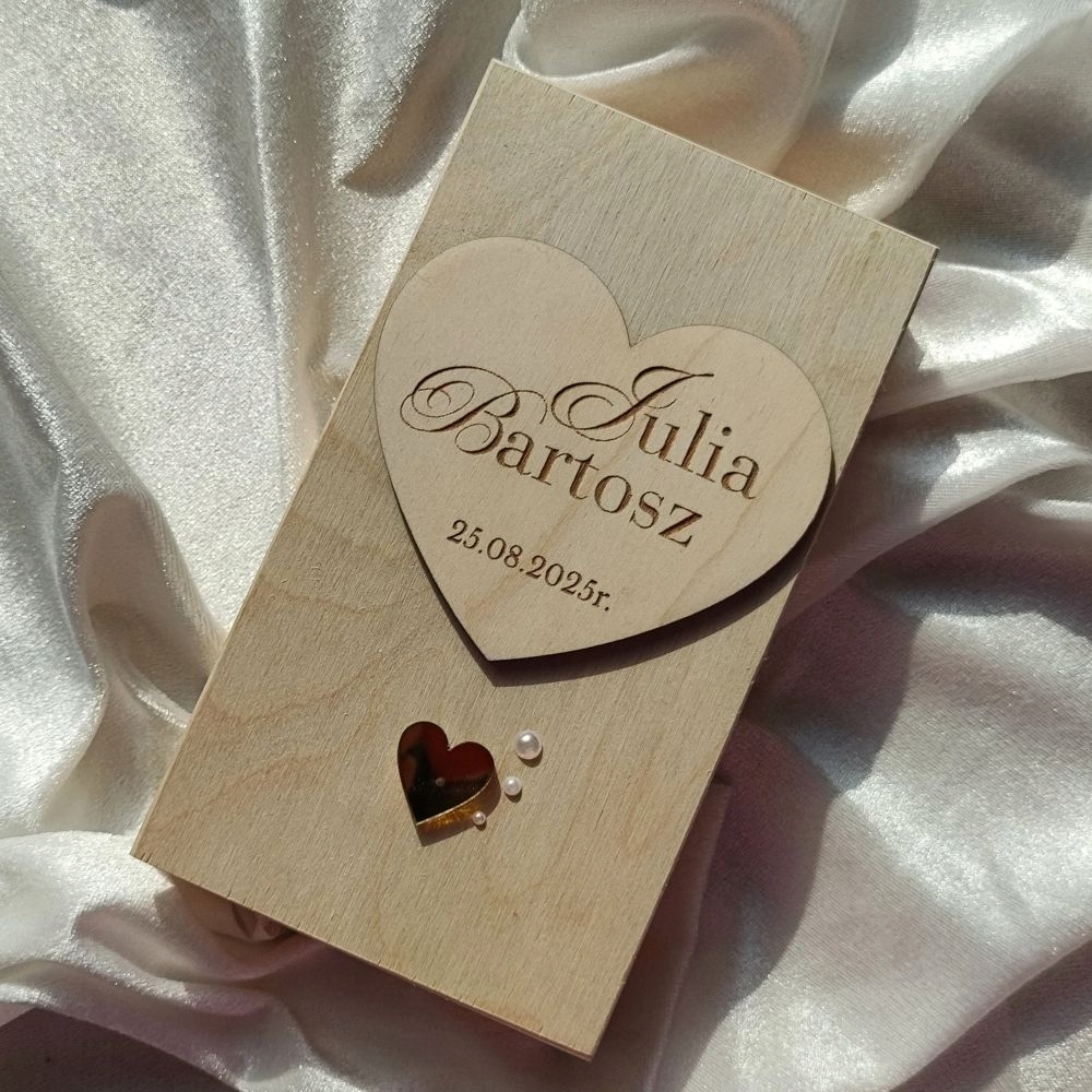 Вместо обычного конверта выберите нашу деревянную коробку для банкнот, что не только красиво выглядит во время церемонии, но и является уникальным сувениром для жениха и невесты!