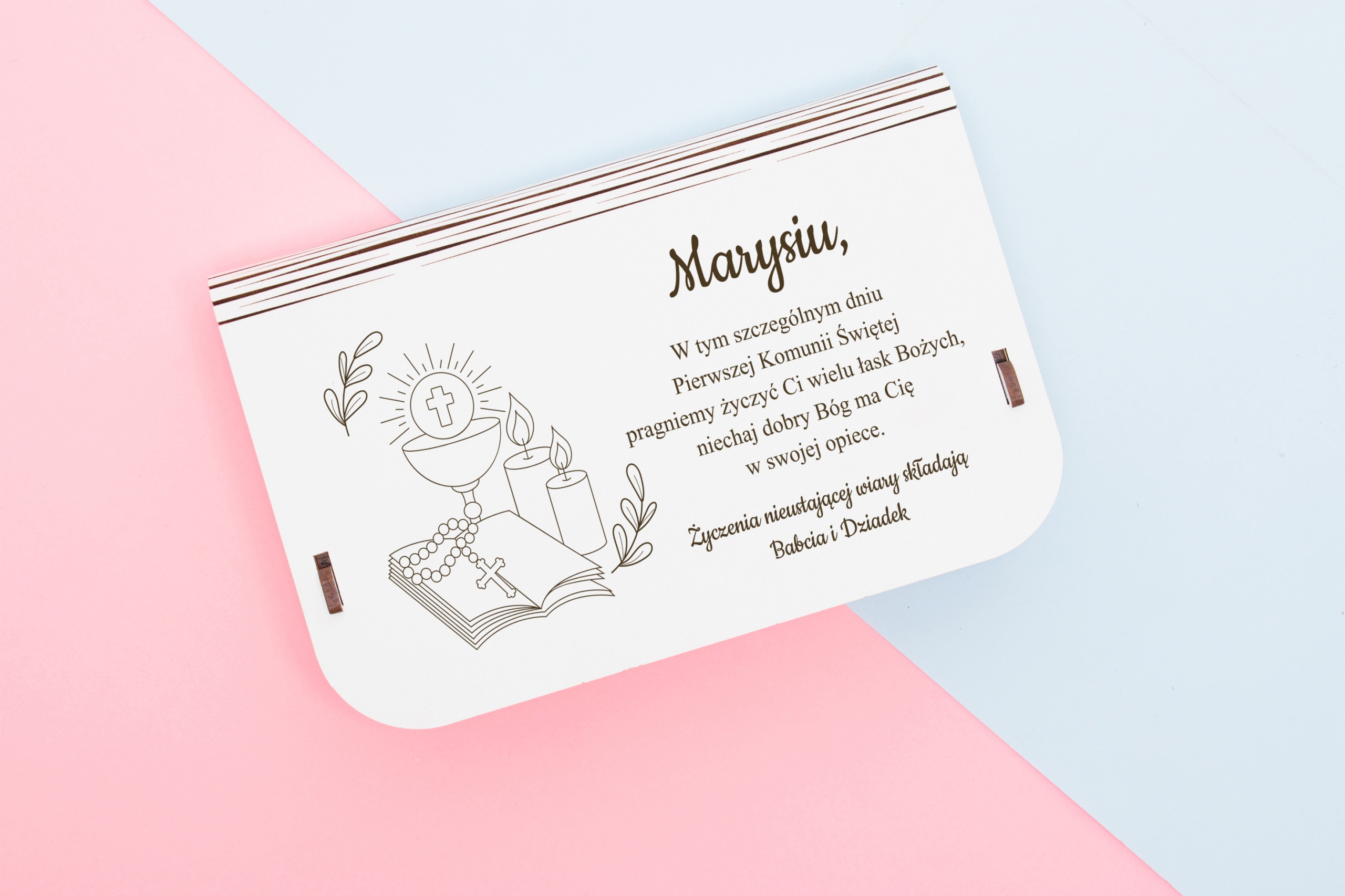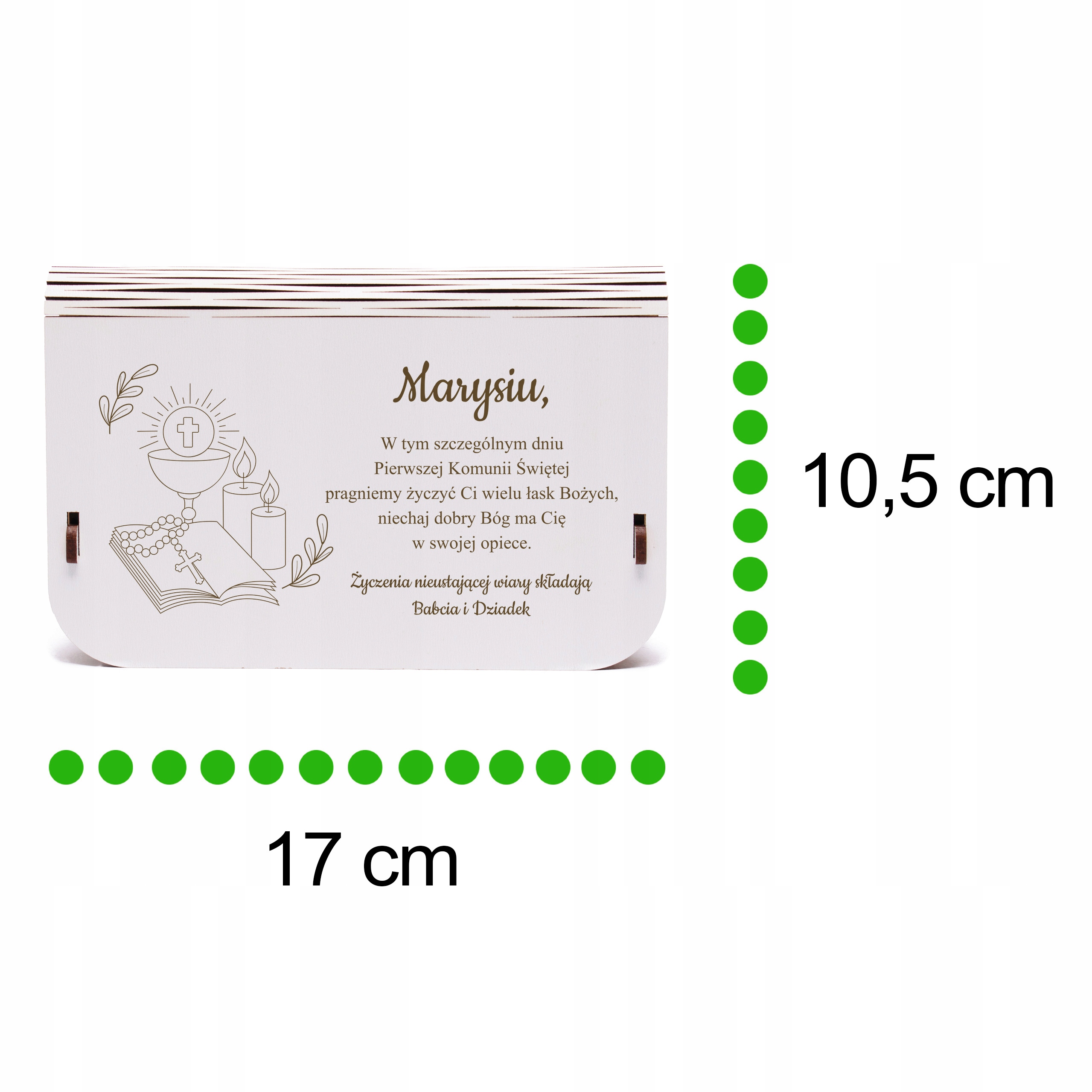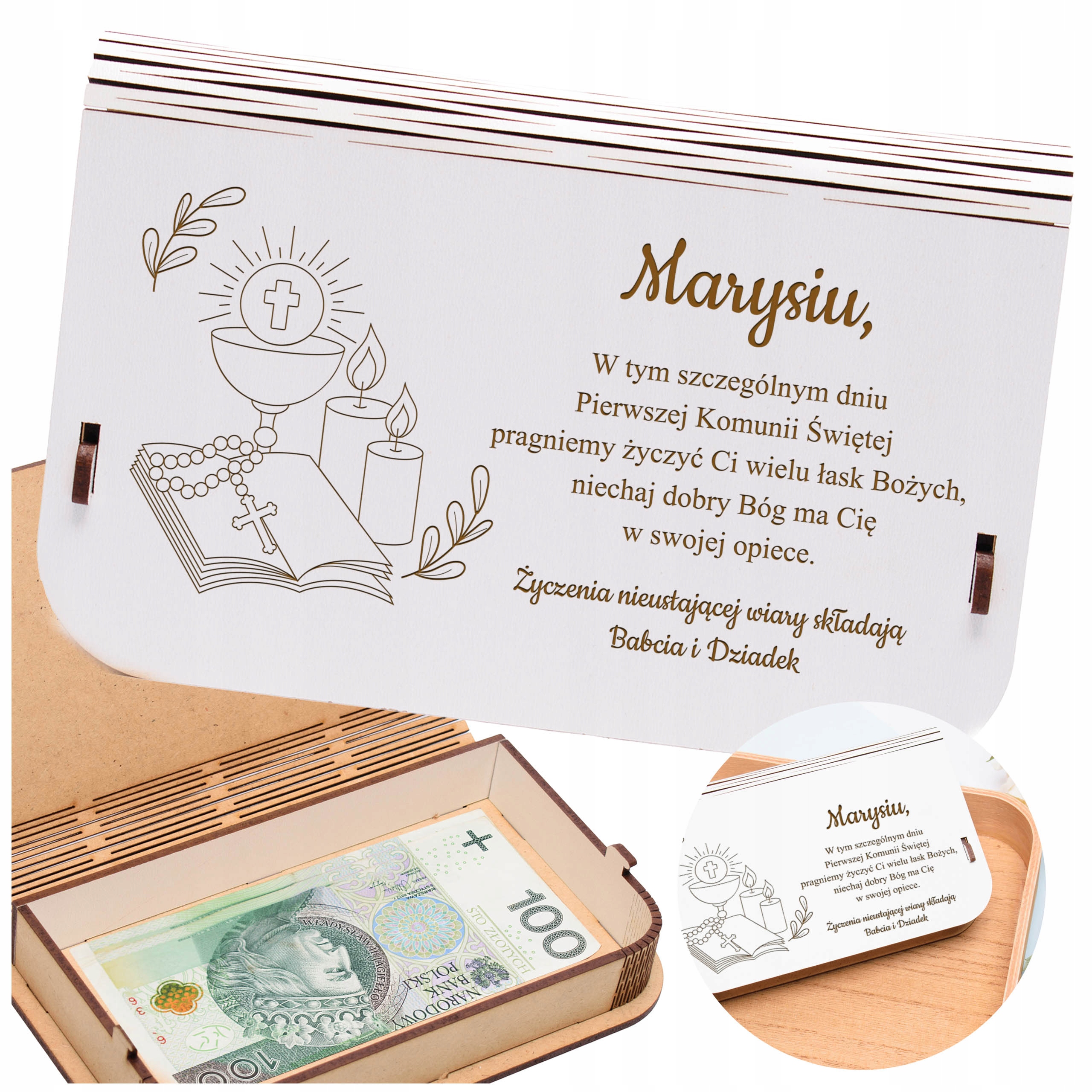 Вам интересно, что купить по случаю первого святого причастия? Если вы хотите, чтобы ваш подарок был как практичным, так и оригинальным, выберите нашу деревянную коробку. Это отличный выбор, который сочетает в себе функциональность с элегантным дизайном, идеально подходящим для любого интерьера. Такой подарок не только облегчит представление классического денежного подарка, но и добавит небольшое очарование пространства. Идеальный способ выразить уважение в этот важный день!