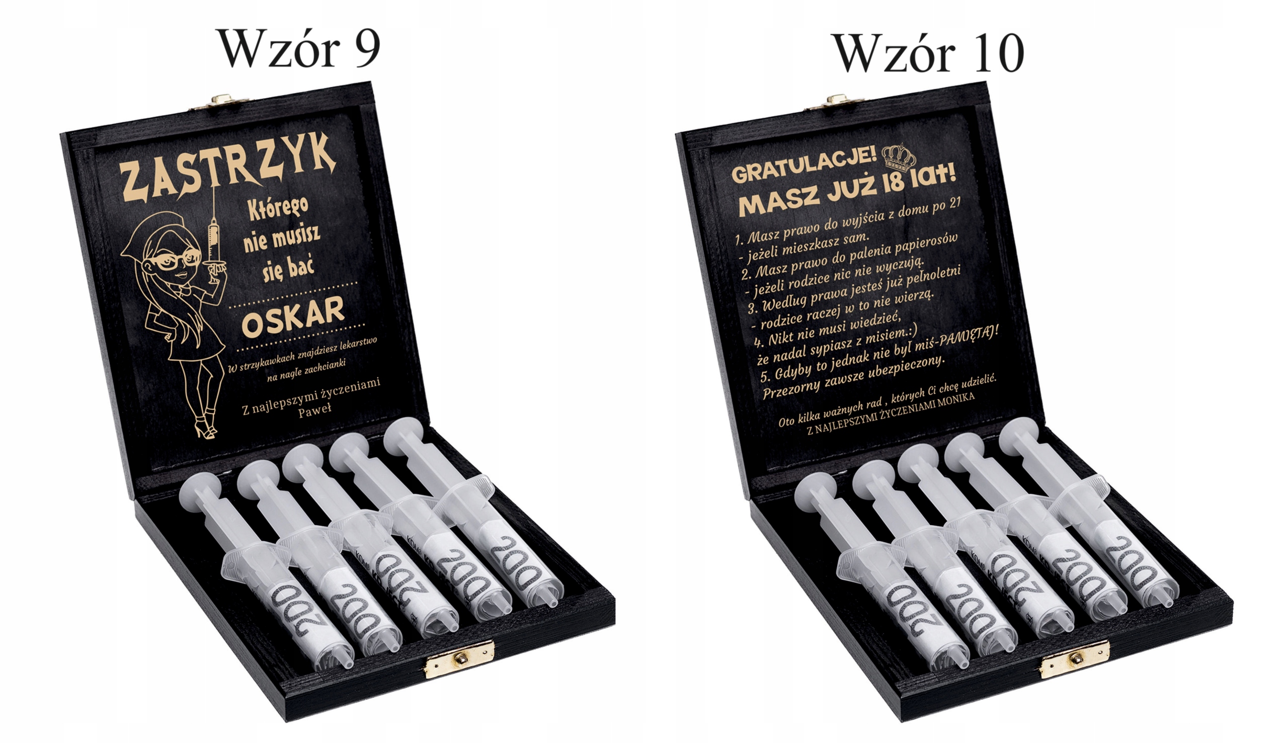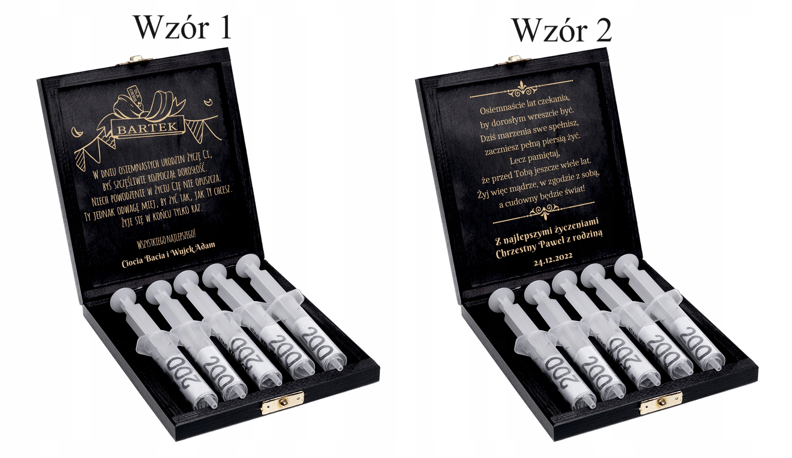 Чтобы оправдать ваши ожидания, мы создали красивую коробку для денег с принтом и гравировкой. Экологически чистые материалы и красивый принт добавляют атмосферы и характера. В шприцы мы можем свободно вставлять купюры, а гравировка желаний внутри заменит классическую открытку. Такой подарок наверняка удивит каждого. На нашу коробку вы можете заменить скучную пластиковую или картонную упаковку. Коробочка с Вашим индивидуальным посвящением и пожеланиями станет незабываемым сувениром на долгие годы.