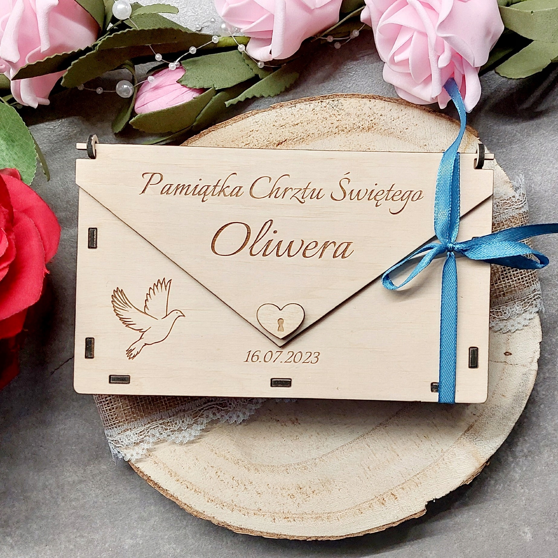 Наше сувенир для крещения В виде деревянного конверта/коробки - отличная идея для подарочного дара крещения, это станет уникальным сувениром для ребенка и гарантированным сюрпризом родителей! Этот деревянный конверт заменит стандартный бумажный конверт и поздравительную карту. Это отличная идея для подарка от бабушки и дедушки, родителей, крестных родителей, семьи или друзей.