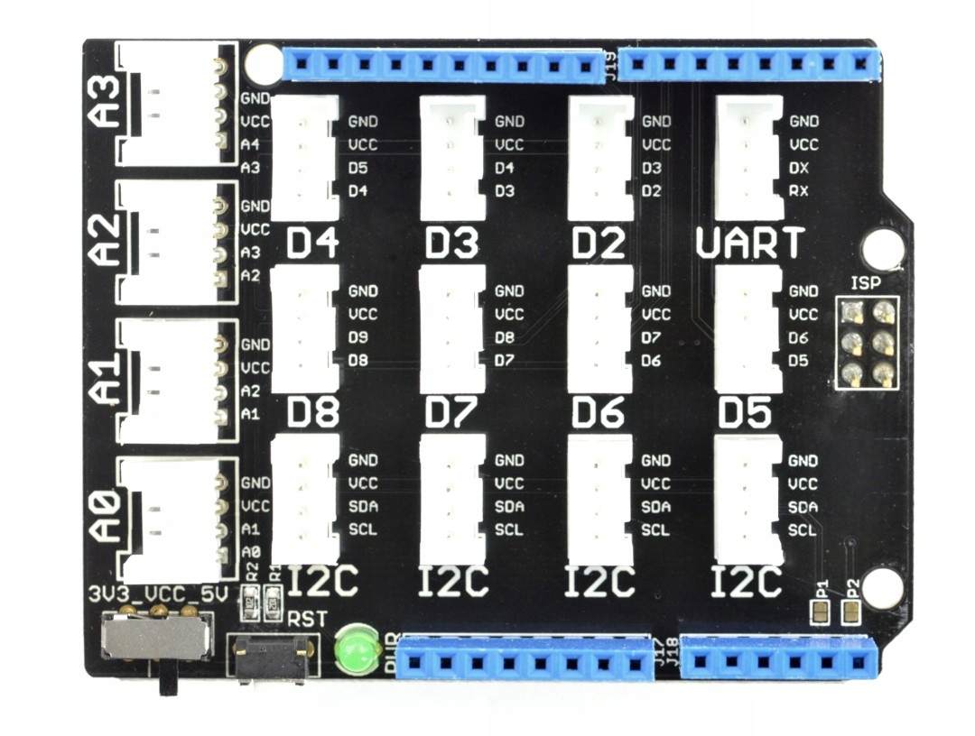 Шилд Arduino, расширяющий возможности контактов ввода-вывода. Адаптирован к модулям и датчикам серии Grove. Он имеет 4-контактные разъемы, а также все контакты, известные у Arduino. Работает с напряжением 3,3 В и 5 В.