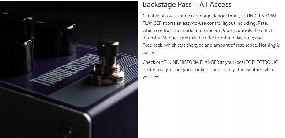 Thunderstorm Flanger -полностью аналоговый эффект фланга, относящийся к винтажным звукам фланца. Он основан на легендарной бригаде ведра и позволяет вам получить полный, распространенный и «трехмерный» звук от нашего инструмента. 4 Скорость управления, глубина, ручная и обратная связь просты в использовании и невероятно эффективны в получении множества различных звуков.