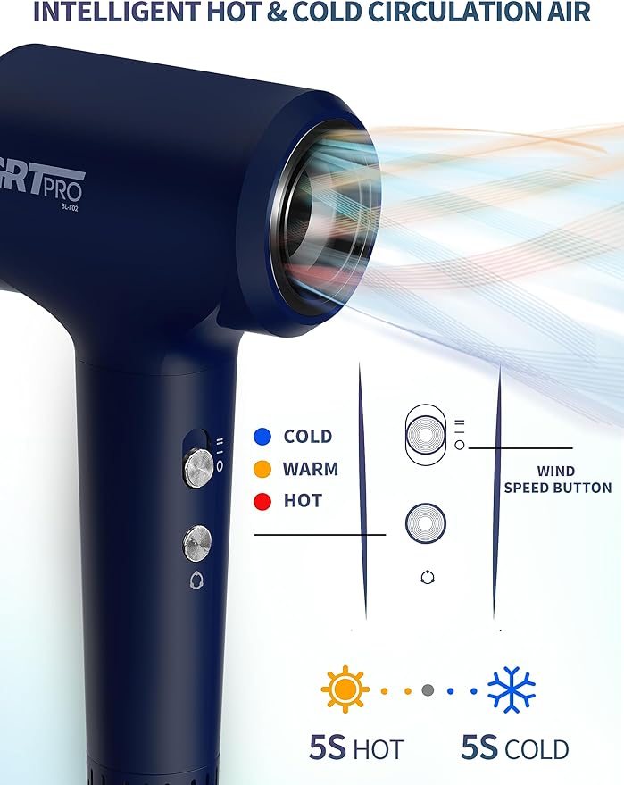 Grt Pro BL-F02-это современный фен с бесщеточным двигателем EC со скоростью до 110 000 об / мин, обеспечивая быструю и эффективную сушку без чрезмерного шума. Он весит всего 370 граммов, что делает его идеально в руке - даже при длительном использовании.