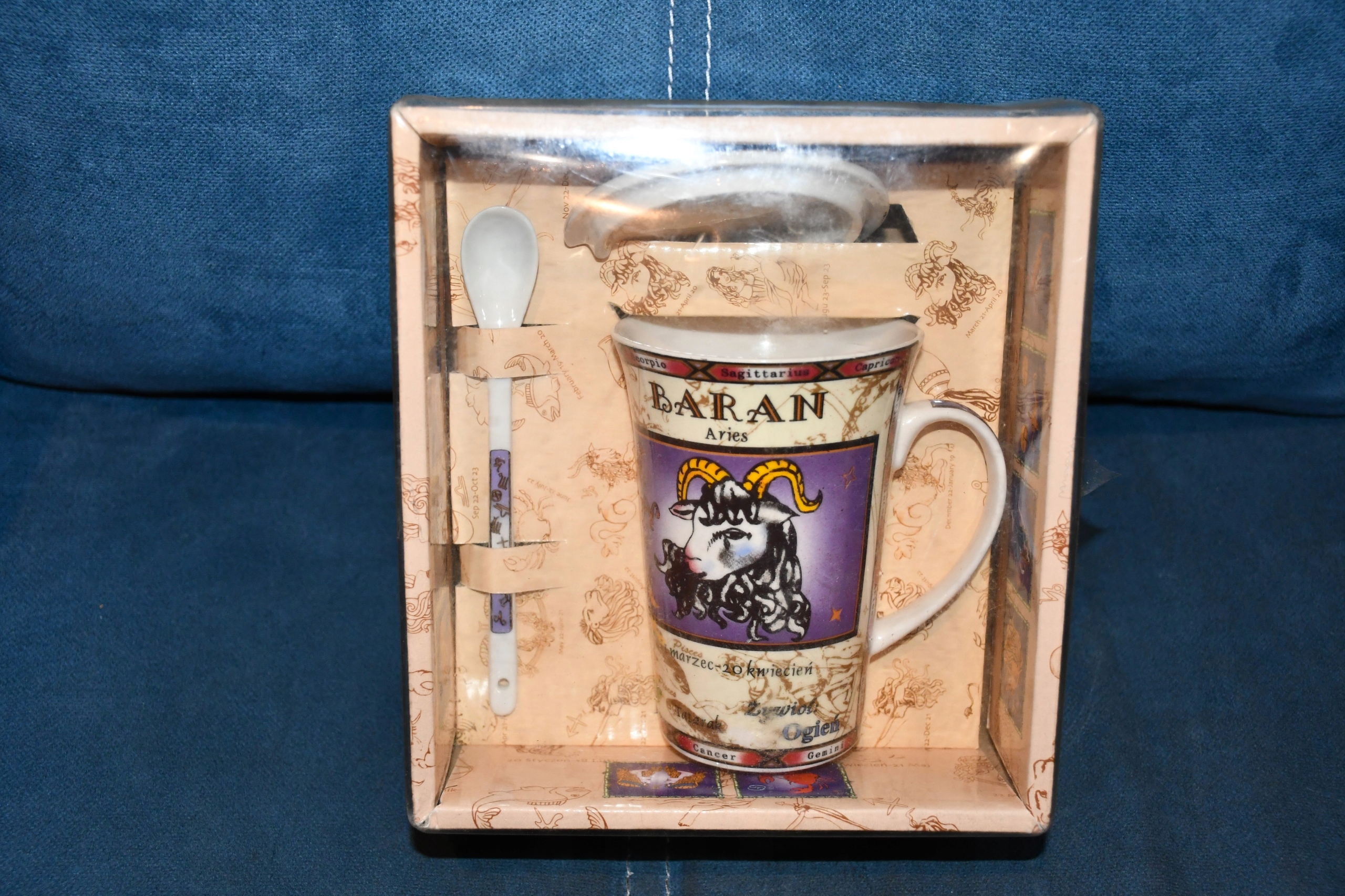 НОВАЯ ФАРФОРОВАЯ КРУЖКА, высота 13 см, емкость 400 мл, С КРЫШКОЙ И ЛОЖКОЙ ГОРОСКОП «БАРАНЫ», УПАКОВКА, КРЫШКА СЛЕГКО ПОТЕРТАНА