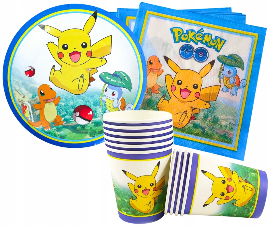 - 10 бумажных стаканчиков + 10 бумажных тарелок + 20 шт. салфеткис персонажами покемонов,