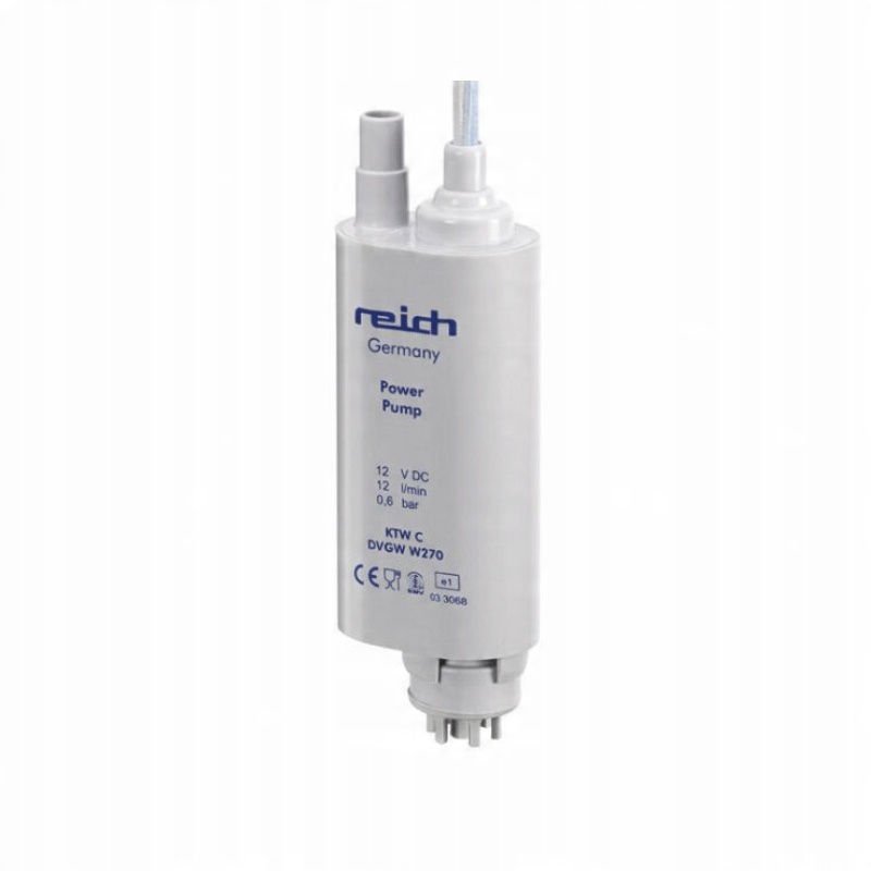 Погружной насос марки REICH предназначен для умывальников, душевых кабин в фургонах, кемперах, яхтах и лодках. Устройство имеет прочную герметизацию. Насос имеет производительность 12 л/мин, отличается очень тихой работой, предназначен для чистой воды. Создаваемое им давление составляет 0,6 бар.