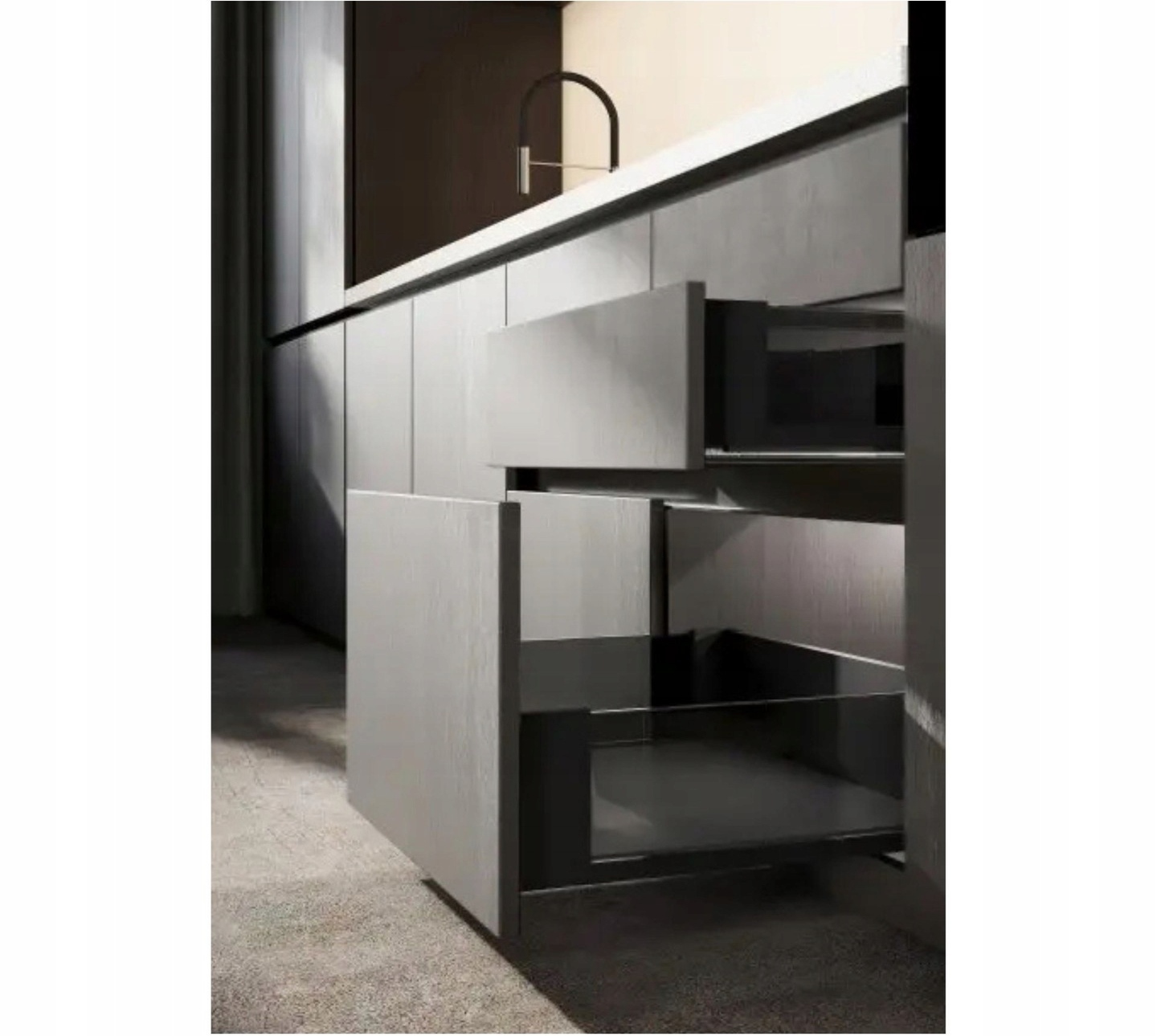 Axis pro Стеклянные стороны смягчены, устойчивы к повреждению и легко чиститься. Сторона ящика шириной всего 14 мм позволяет максимально использовать внутреннее пространство мебели. Закрытие