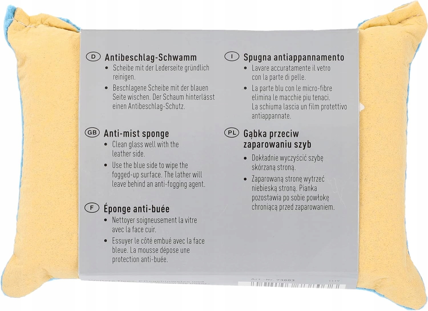Губка против запотевания эффективно очищает стекло и удаляет с него конденсат. Он обеспечивает хорошую обзорность, что влияет на безопасность вождения. Желтая сторона (кожа) – для очистки стекла, синяя – для удаления водяных паров. Оставляет покрытие, защищающее от повторного запотевания.