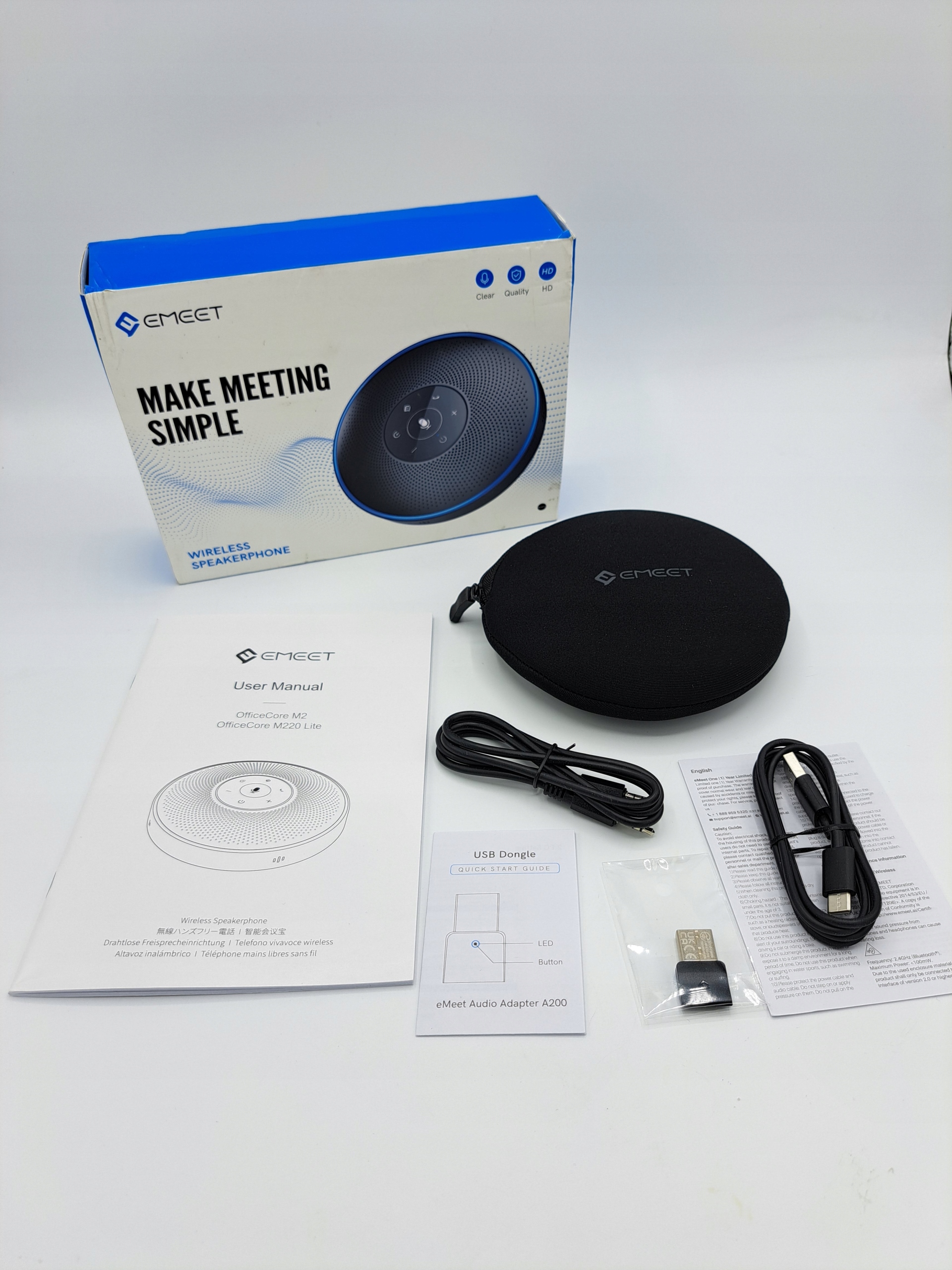 Уникальный интеллектуальный алгоритм VoiceIA, разработанный eMeet, снижает шум в офисе таких как звуки клавиатуры, шум принтера, кондиционеров и т. д., а также устраняет эхо и усиливает голоса. Полнодуплексная связь. Plug-and-play, подключение через Bluetooth, USB, Aux. Управление через элегантную сенсорную панель. Светодиодная подсветка с голосовой локализацией. Легкий и компактный дизайн, дополненный дорожным футляром и адаптером Bluetooth.