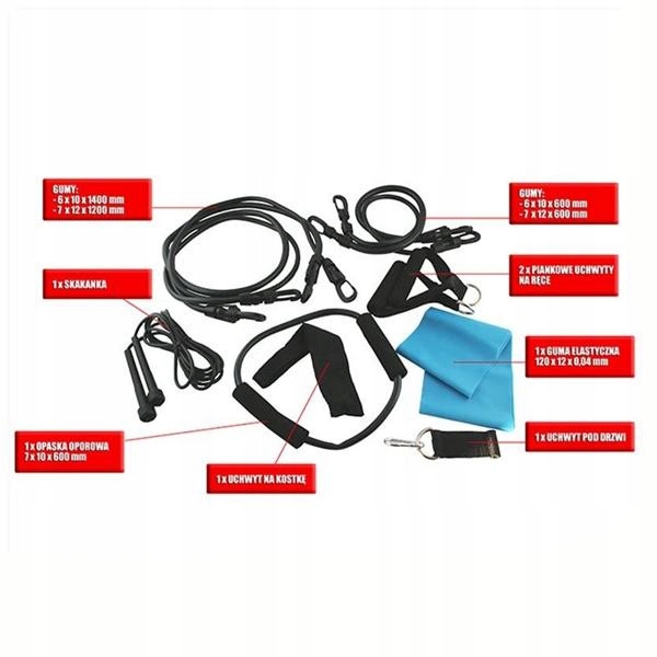 TX02 HMS – комплекс упражнений. Продукт использует вес тела пользователя для улучшения его физической формы и силы. Высокое качество, продуманная конструкция и долговечность гарантируют успешные тренировки в любых условиях. В комплект входят четыре эластичных ленты, одна эластичная лента, одна эластичная лента, две пенопластовые ручки для рук, одна ручка для щиколотки, одна дверная ручка и скакалка. Устройство представляет собой современный способ тренировок в духе CrossFit. Каждая пара тросов имеет разную жесткость, что позволяет выбирать упражнения с отягощениями разной интенсивности. Каждый из них имеет ручку, позволяющую проводить комплексную силовую тренировку всех групп мышц.