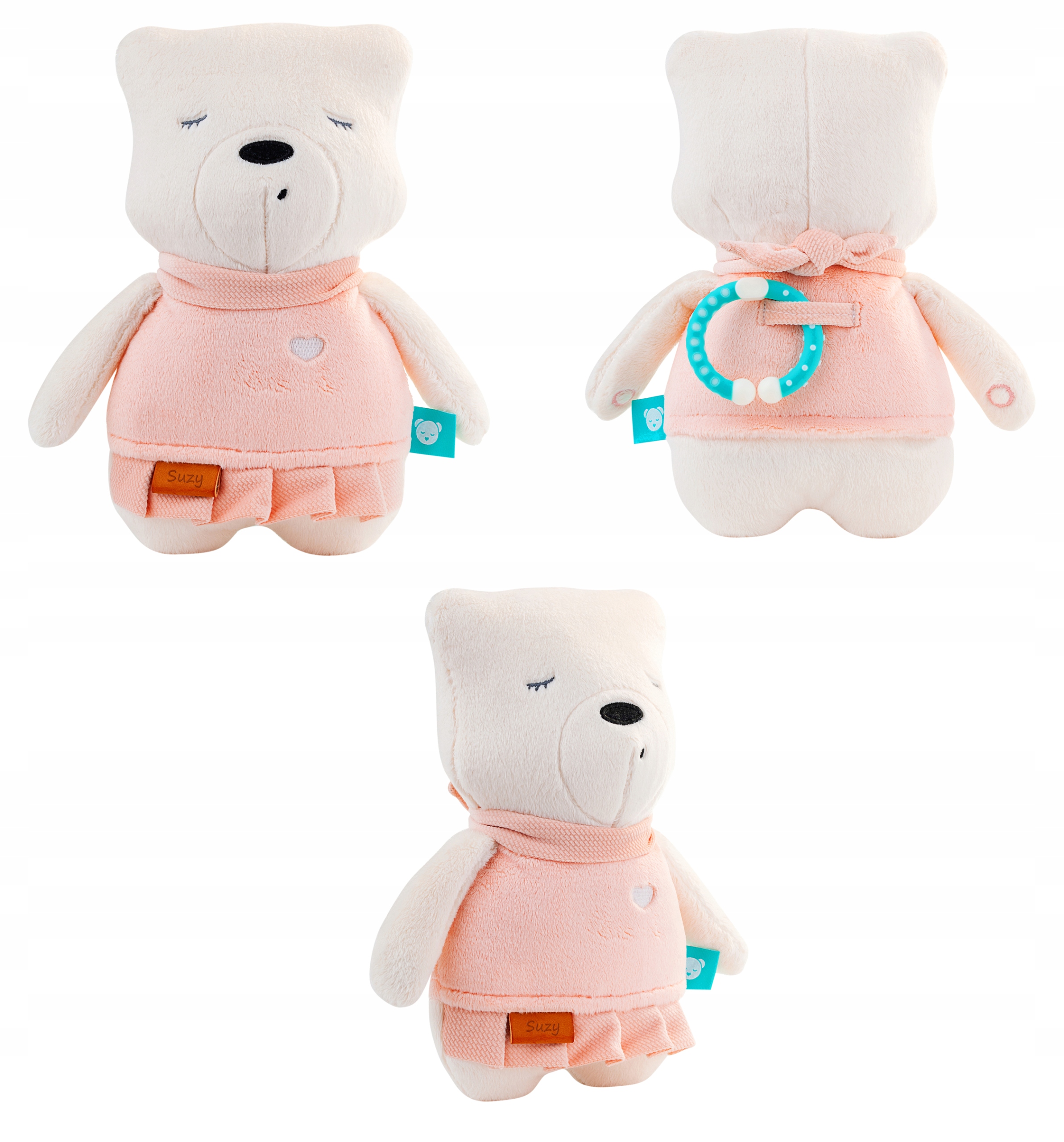 Это также отличная мягкая игрушка для сна. Во время сна ребенок может прижиматься к мягкому жужжащему плюшевому мишке. Он также будет хорошо работать во время игр, поездок и прогулок благодаря удобной подвеске-прорезывателю.