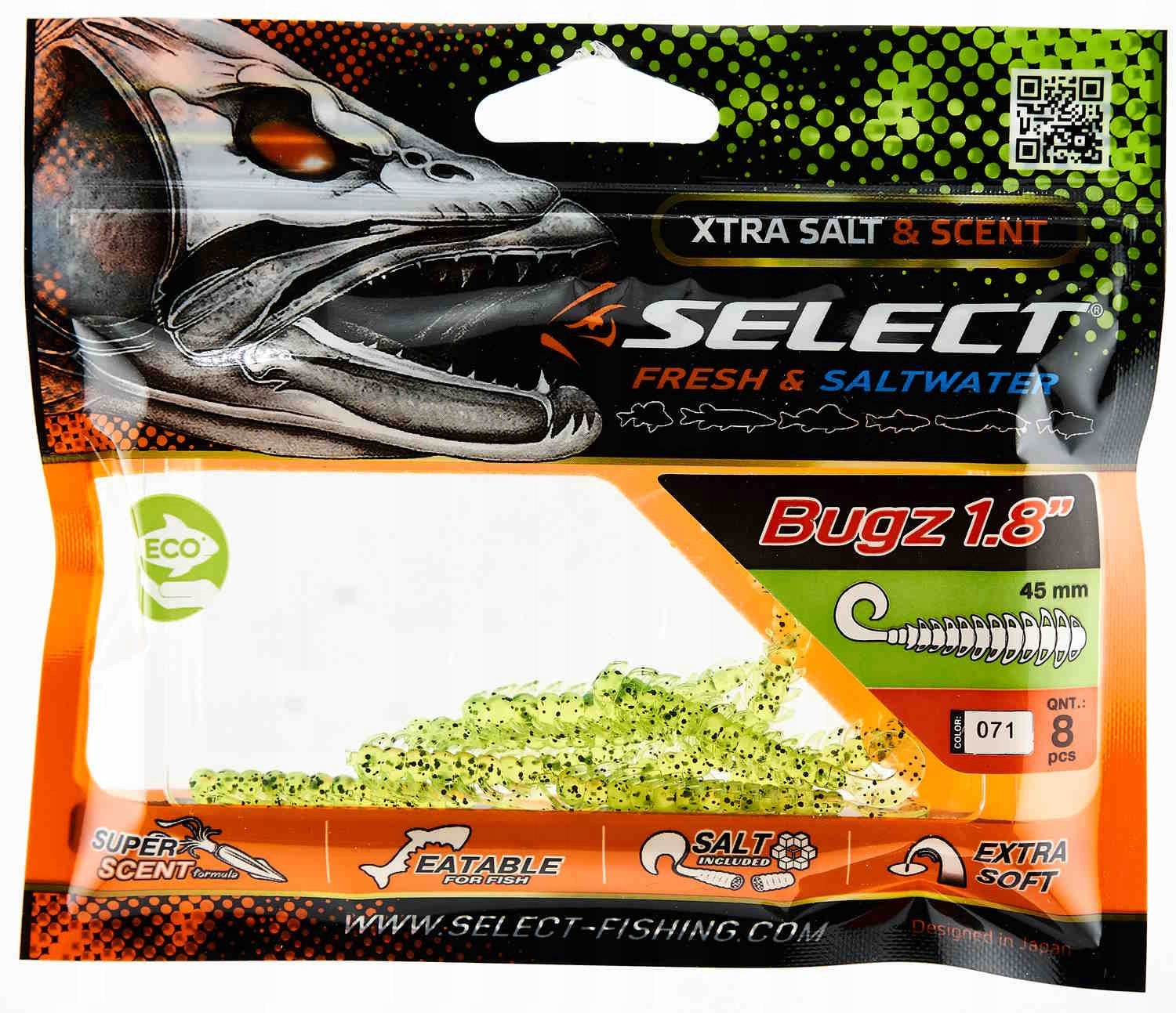 Активная приманка. Его неправильная форма, насекомоподобные ноги и небольшой хвост создают привлекательные для хищника вибрации. Хвост приманки располагается в одной плоскости с ее телом, что в зависимости от способа армирования может дополнительно усиливать ее неравномерность действия. Bugz изготовлен из современного, мягкого, безопасного и съедобного силикона. Приманка особенно нравится охотникам на окуня, но ее жертвой часто становятся судак и щука.