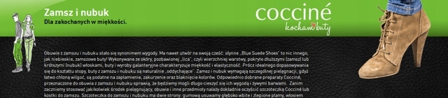 ПРИСУТСТВУЕТ НА ПОЛЬСКОМ РЫНКЕ С 1999 ГОДА. ПРИОБРЕТАЛА ОПЫТ СОТРУДНИЧЕСТВА С ПРОИЗВОДИТЕЛЯМИ ОБУВИ И КОЖАНЫХ ИЗДЕЛИЙ. НЕЗАВИСИМО ОТ ПОГОДЫ, СЕЗОНА И ТИПА МАТЕРИАЛА, ПОКУПАТЕЛИ COCCINÉ МОГУТ НАДЕЖНО НАСЛАЖДАТЬСЯ ПРАКТИЧНЫМ ВНЕШНИМ ВИДОМ ОБУВИ И КОМФОРТОМ ПРИ ИСПОЛЬЗОВАНИИ НАДЕЖНОЙ ПОЛЬСКОЙ ПРОДУКЦИИ.