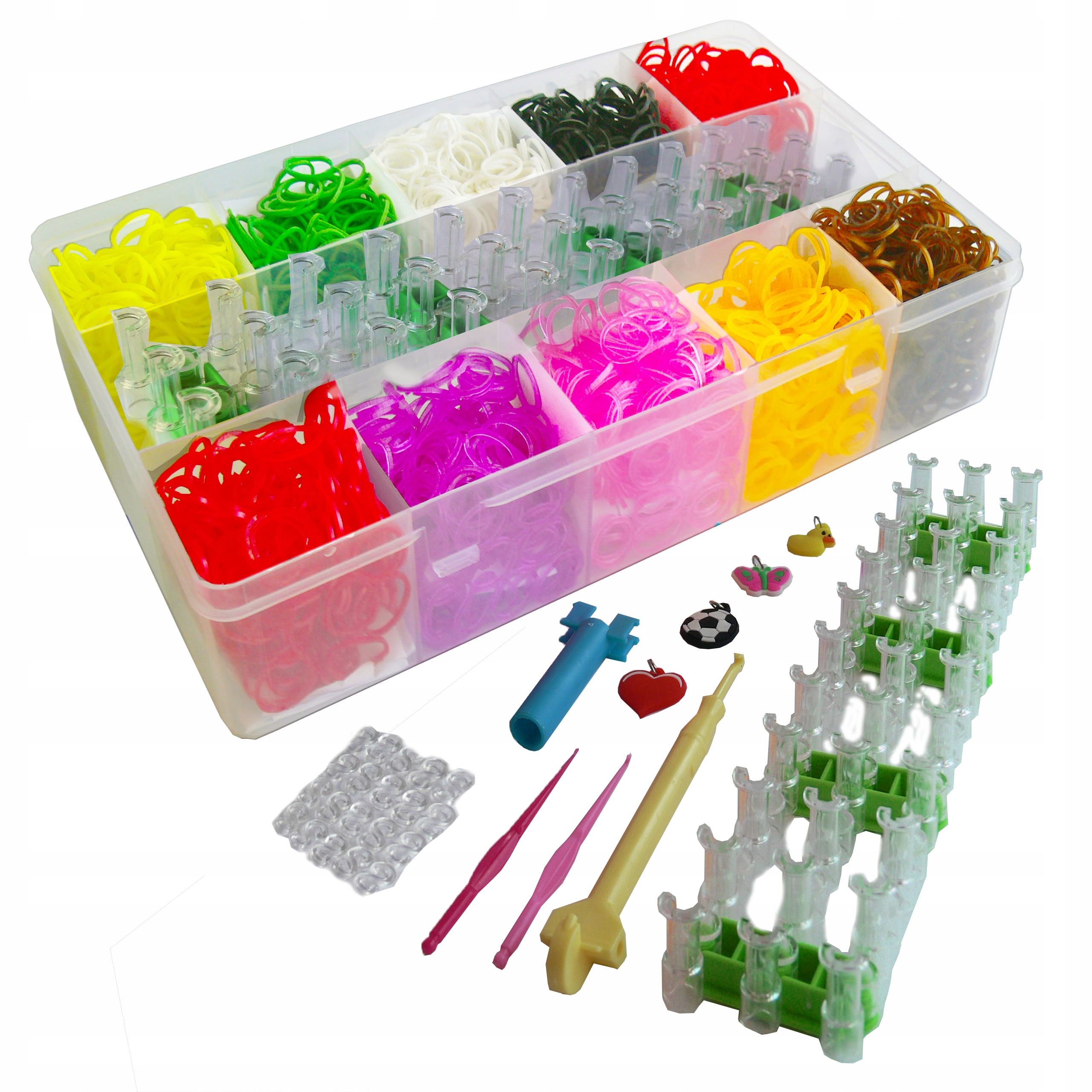 Креативный набор, состоящий из 2000 штук резинок, для изготовления украшений как для девочек, так и для мальчиков. Это мастерская прямоугольного плетения, где из разноцветных резинок можно сделать браслеты, кольца или ожерелья. Красочные браслеты можно свободно компоновать с любыми мотивами и цветами по вашему выбору.