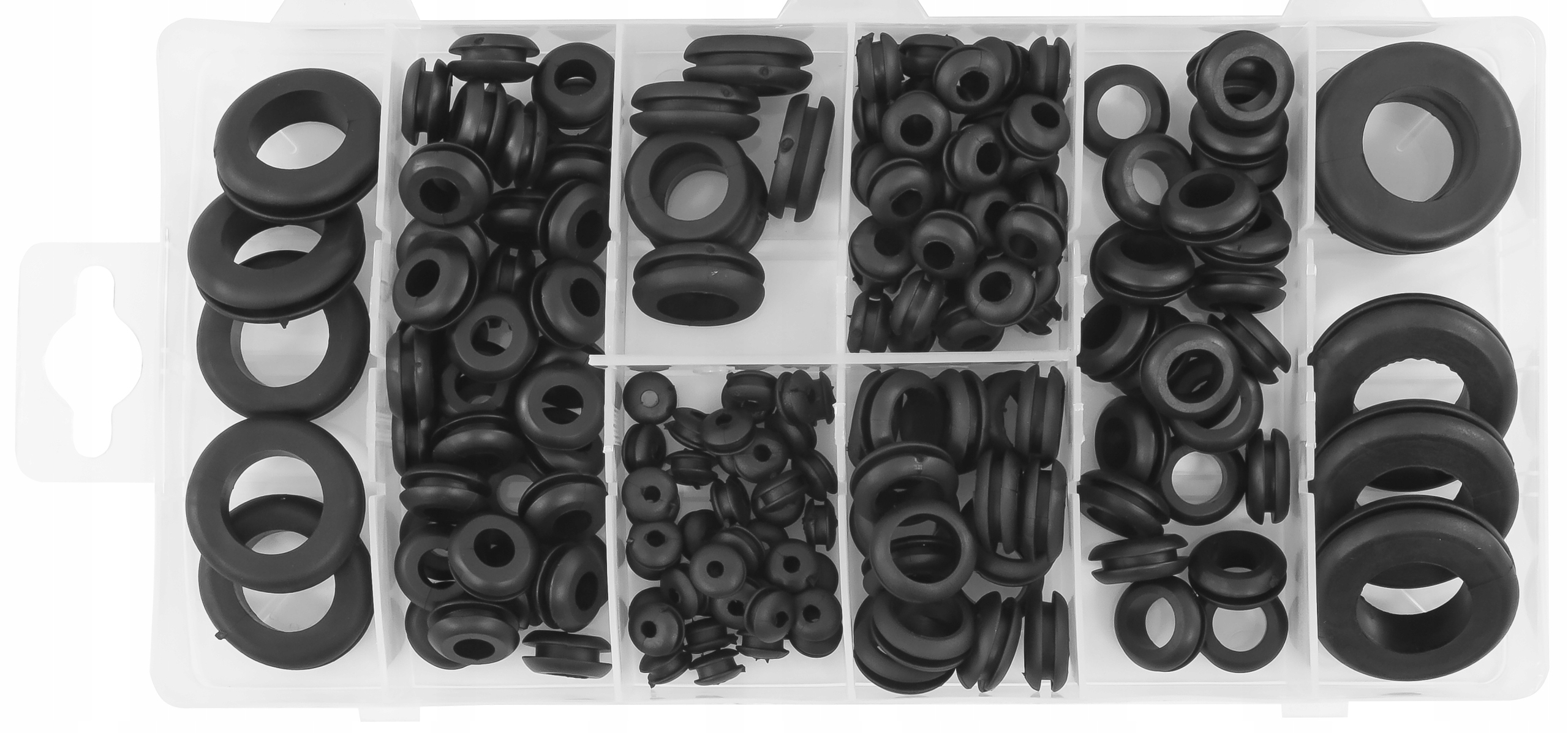 В наборе 180 шт. резиновые втулки для отверстий – незаменимый инвентарь в каждой мастерской или гараже.