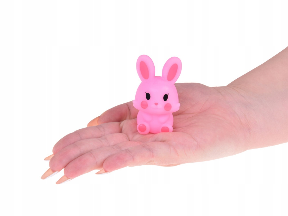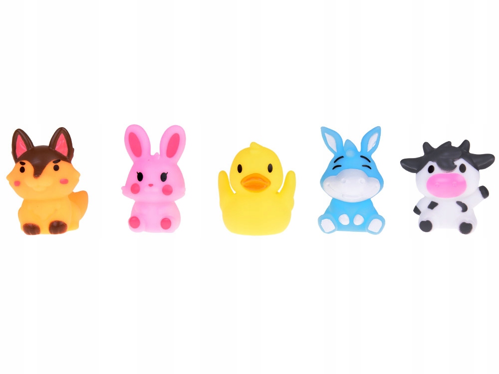 - 5 резиновых фигурок животных зоопарка, каждая разного цвета (кролик, корова, собака, утка, осел), размеры примерно 5 см х 4 см х 4 см.