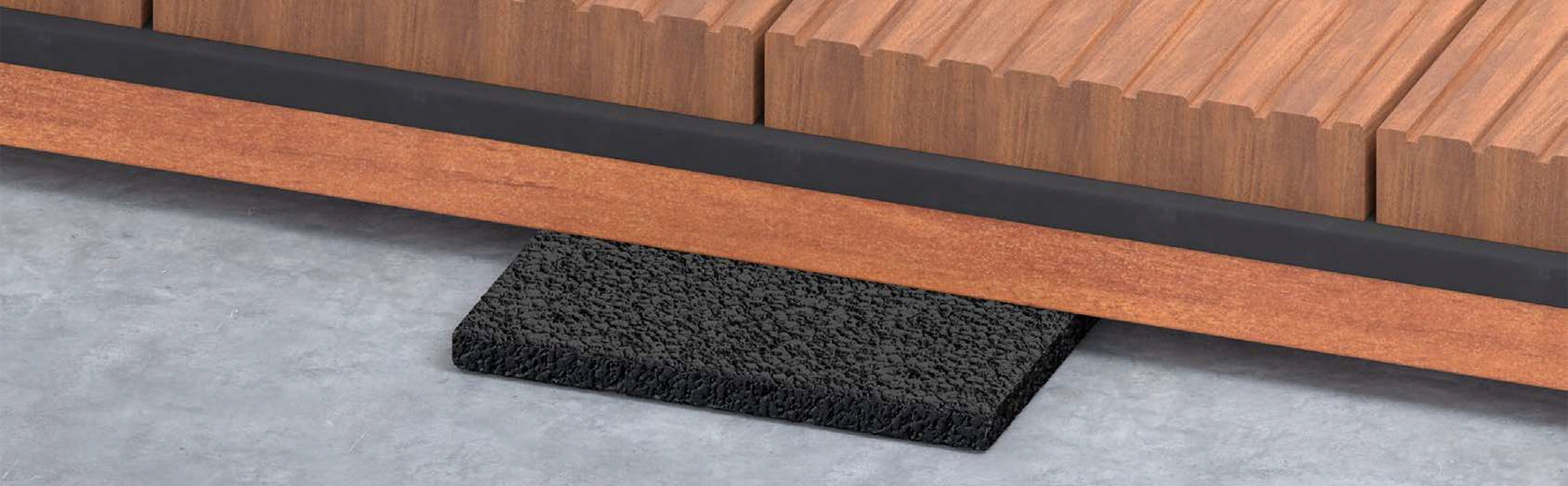 Лаги террасы, которые лежат и непосредственно соприкасаются друг с другом, подвержены гниению. В результате постоянного влажного контакта древесины с землей возникают повреждения, препятствующие безопасному использованию террасы. Использование резиновых прокладок под балками террасы позволяет продлить срок службы балок террасы. Кроме того, резиновые накладки обладают звукоизоляционными свойствами, а значит, терраса будет тихой в использовании и не будет передавать вибрации.