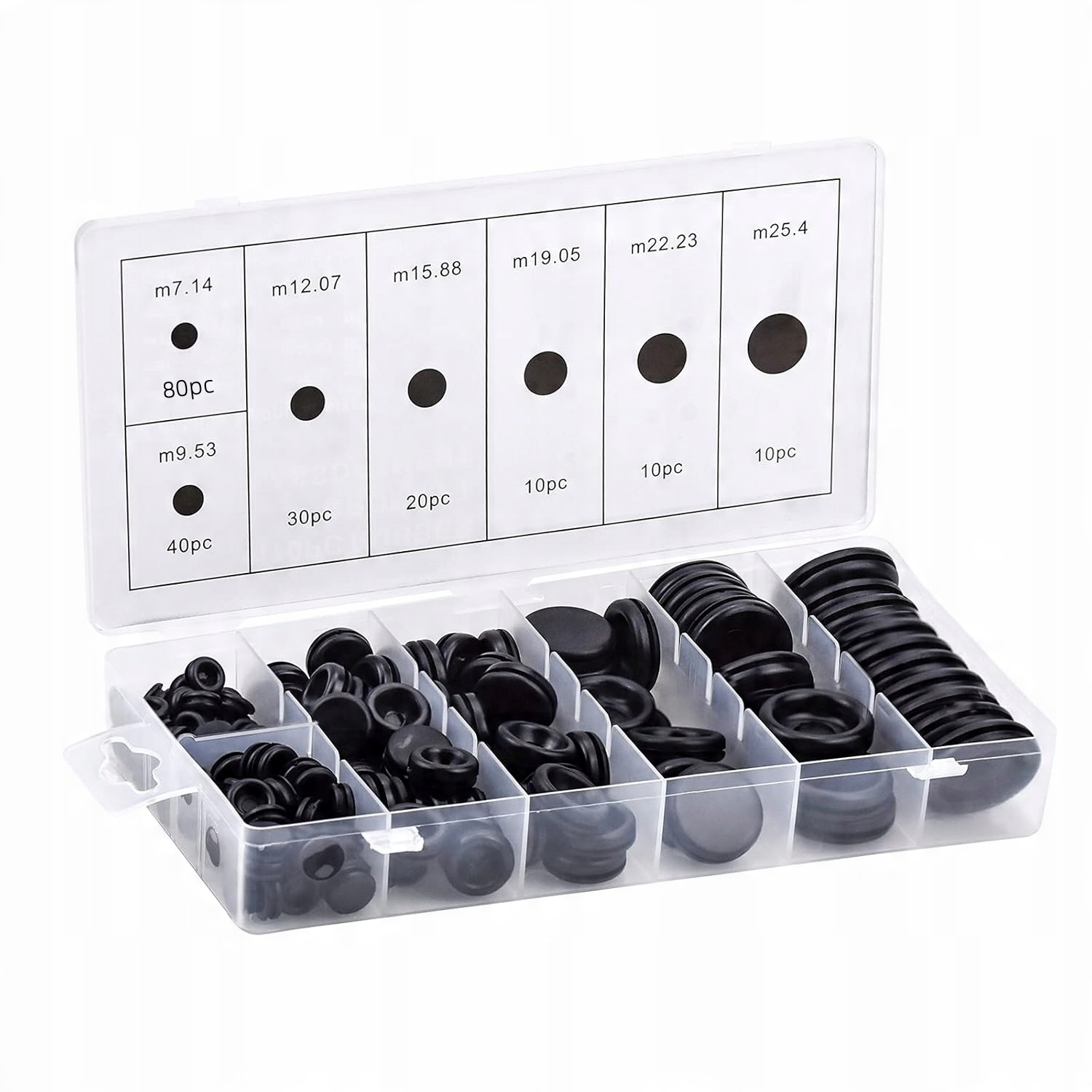 - Всего 200 штук резиновых заглушек, 7 мм х 80 штук, 9 мм х 40 штук, 12 мм х 30 шт., 16 мм х 20 шт., 20 мм х 10 шт., 22 мм х 10 шт., 25 мм х 10 шт.