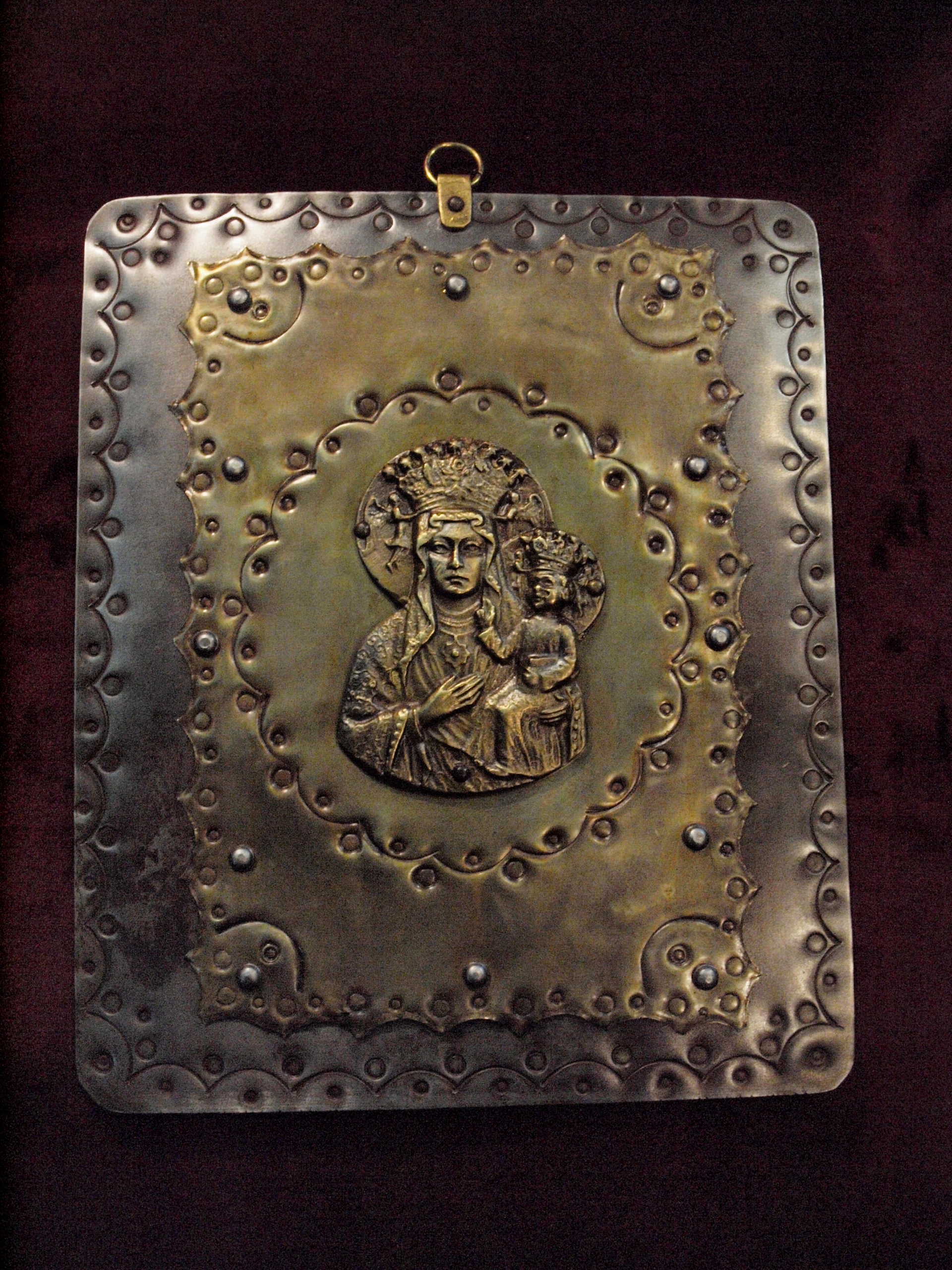 Посередине, в репуссе, медальон ( изготовлена по оригиналу XVIII века методом выплавляемого воска) с изображением Ченстоховской Богоматери - покровительницы рыцарей и польского войска.