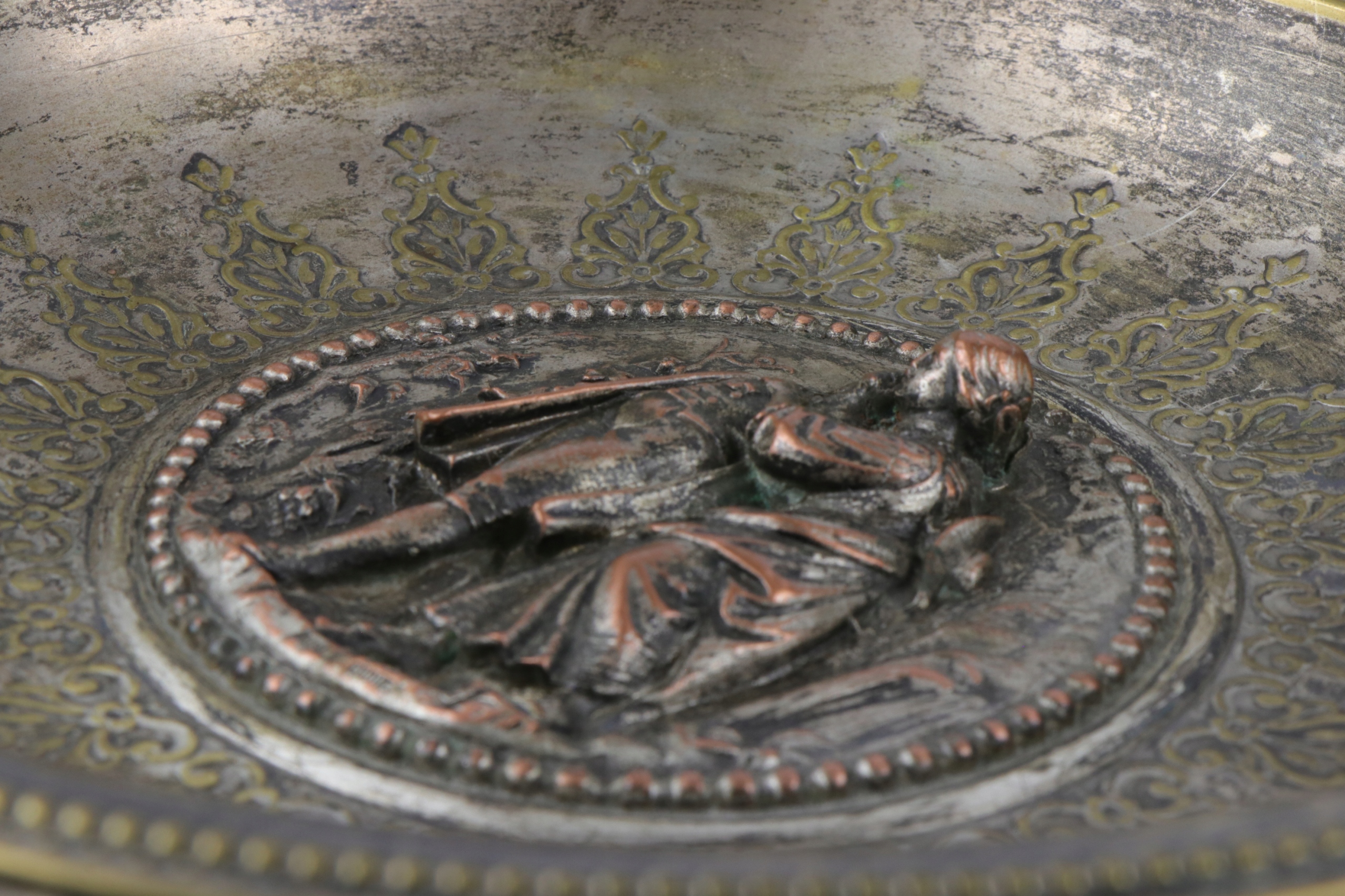 Тарелка, украшенная в центральной части парой молодых влюбленных. Подписанная тарелка, очень богато украшенная рельефным орнаментом в стиле историзма.