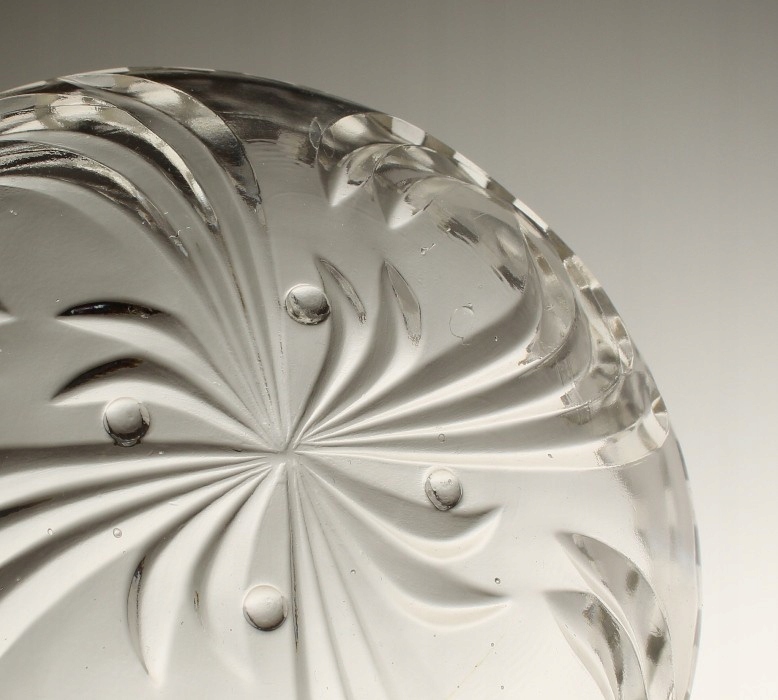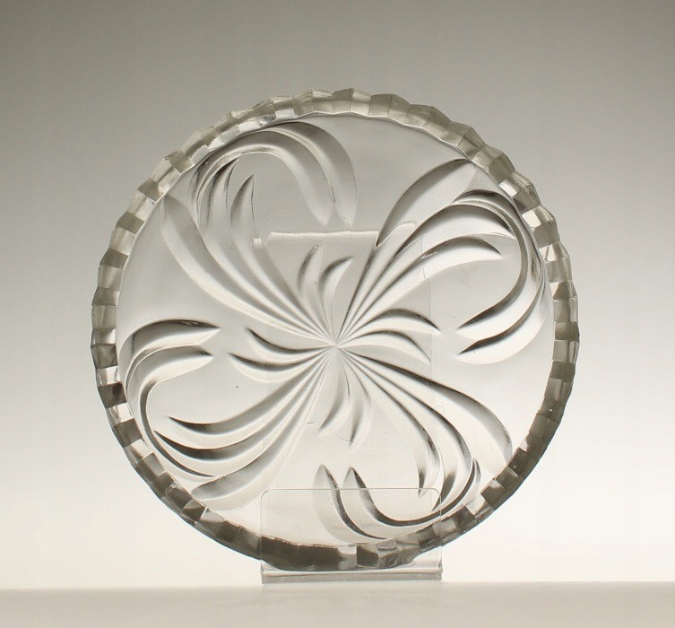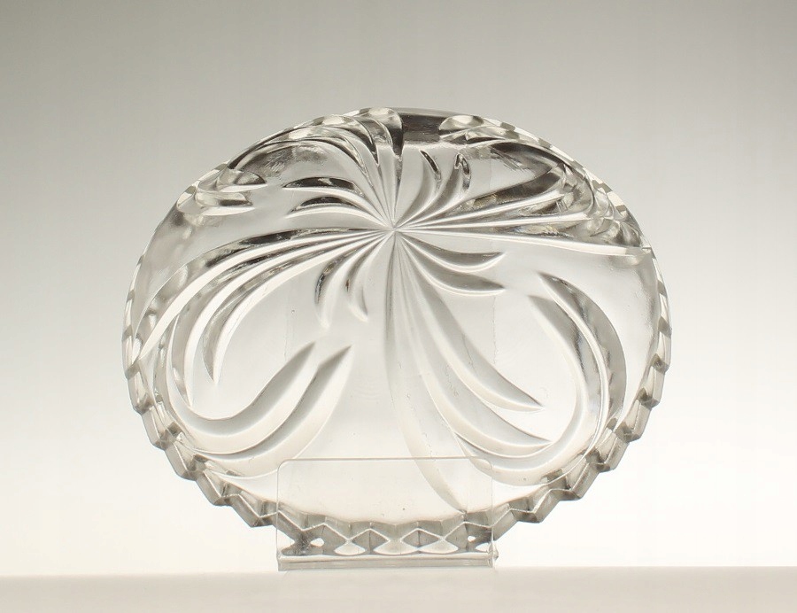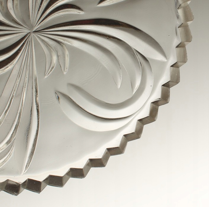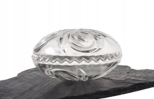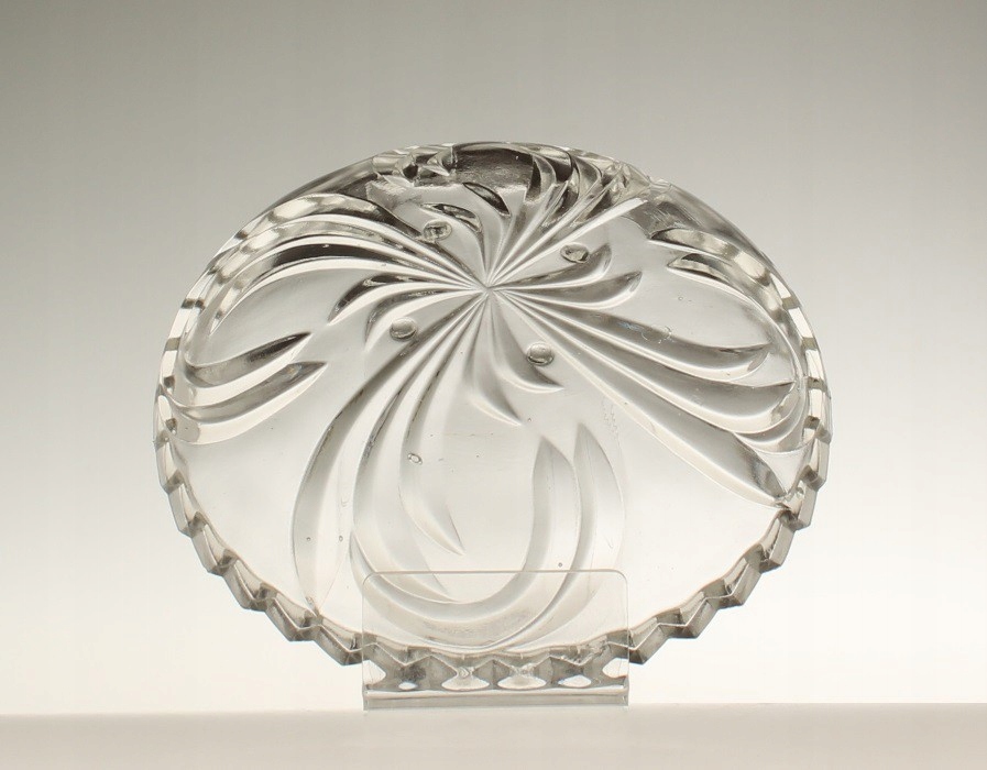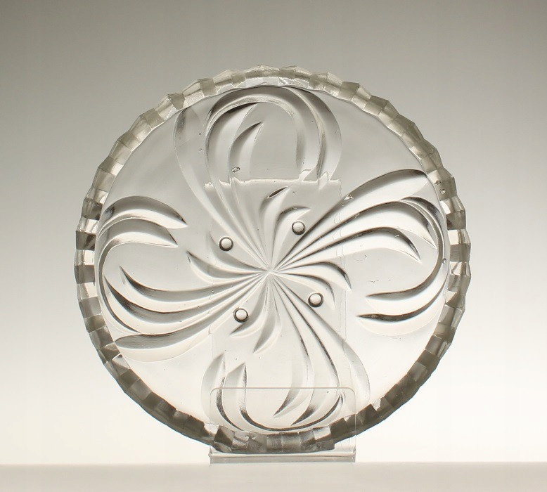 Шоколадница из бесцветного прессованного стекла, украшенная снаружи растительным мотивом. Соединение чаши и крышки зигзагообразное. Произведено на Хозяйственном стекольном заводе «Гортензия» в Петркуве-Трыбунальском. 1970-е годы