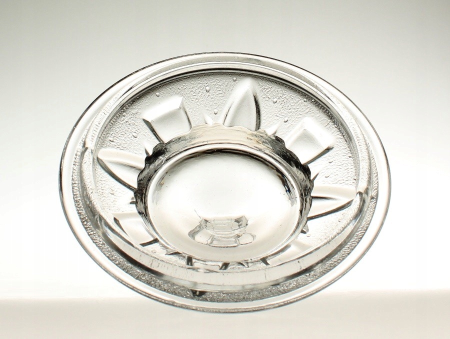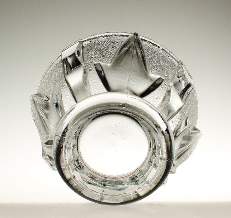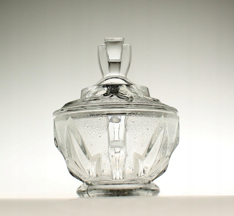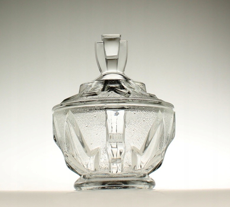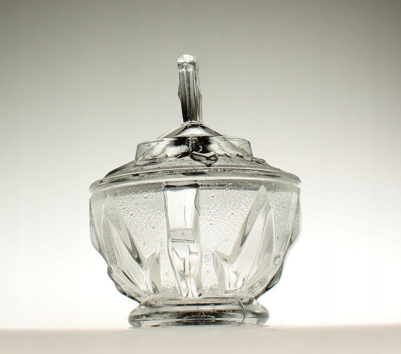 Шоколадница из бесцветного прессованного стекла. Произведено на Хозяйственном стекольном заводе «Гортензия» в Петркуве-Трыбунальском. 1970-е годы