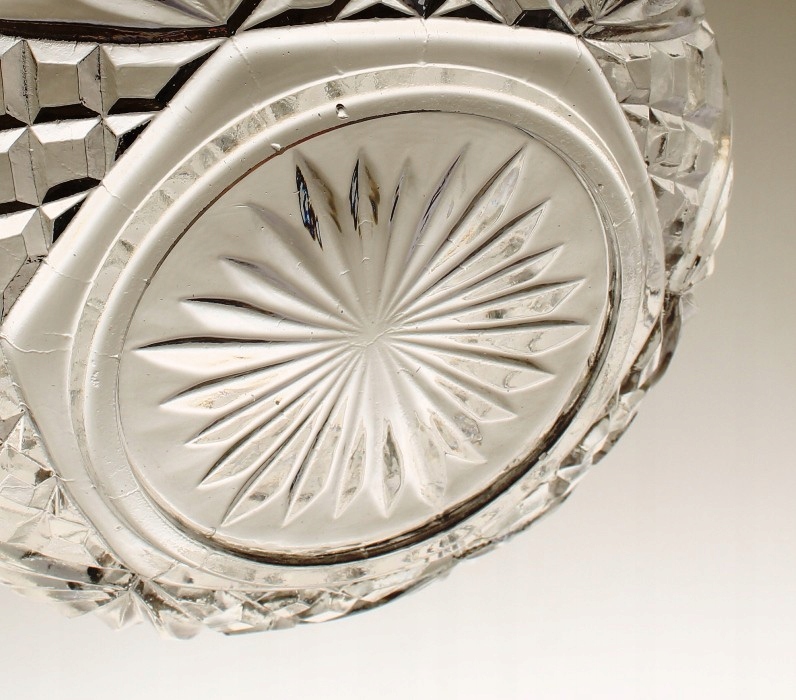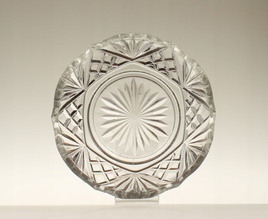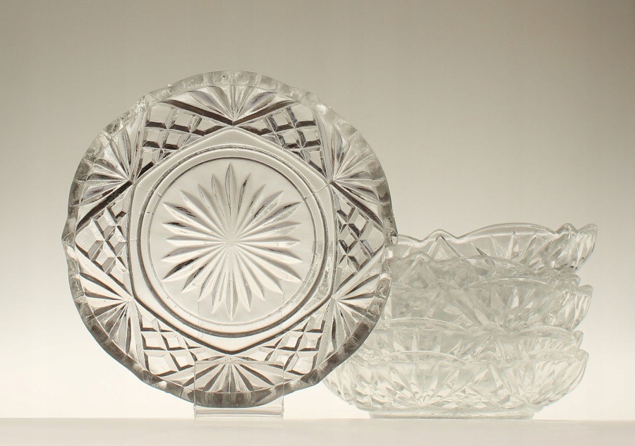 Шесть салатников из бесцветного прессованного стекла. Воротники украшены рельефными лепестками и ромбами, в основании - розетка. Салатницы произведены на Хозяйственном стекольном заводе «Гортензия» в Петркуве-Трыбунальском. В каталоге 1936 года. № 395. Представленные модели изготовлены в послевоенное время.