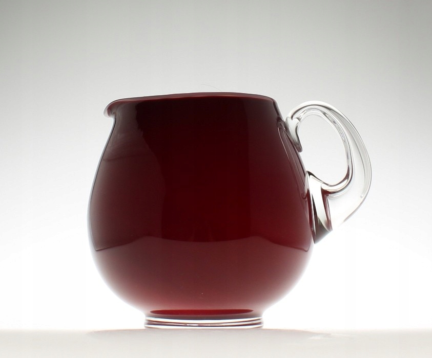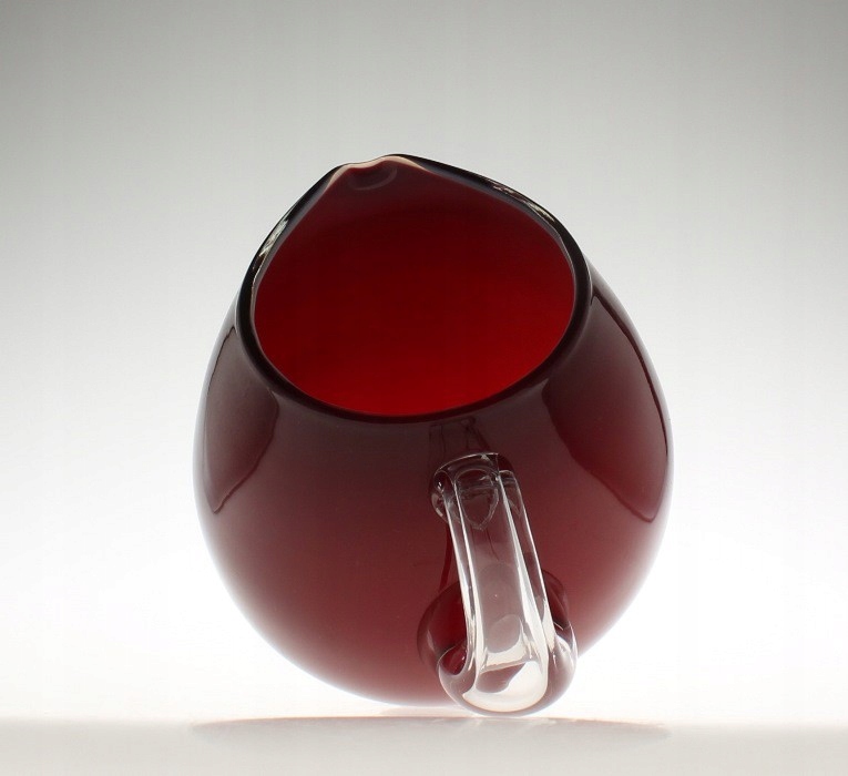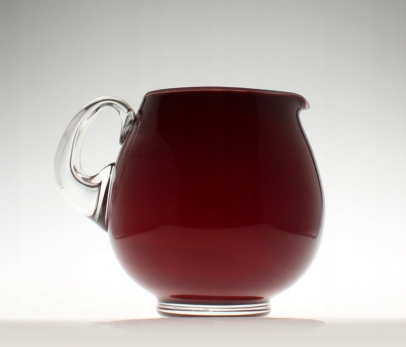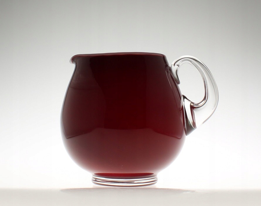 Кувшин для напитков изготовлен из многослойного натриевого стекла ручной формовки: внешний слой бесцветный, средний бордовый, внутренний беловатый. Початок бесцветный, основание полированное. Кувшин произведен на Тарновецком стекольном заводе в Тарновце. 2-я половина 20 век