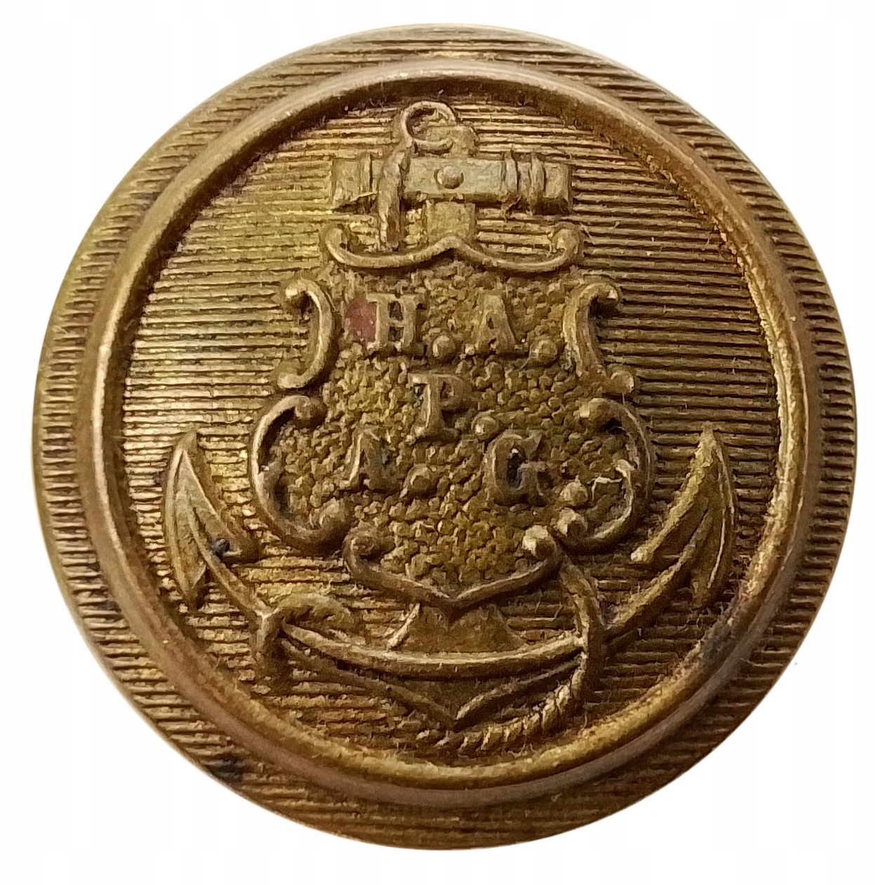 Пуговица форменная для сотрудника транспортной компании Hapag, двухслойная, с обратной маркировкой диаметра, монограммой производителя и "HOCHFEINE QUALITÄT", латунь.