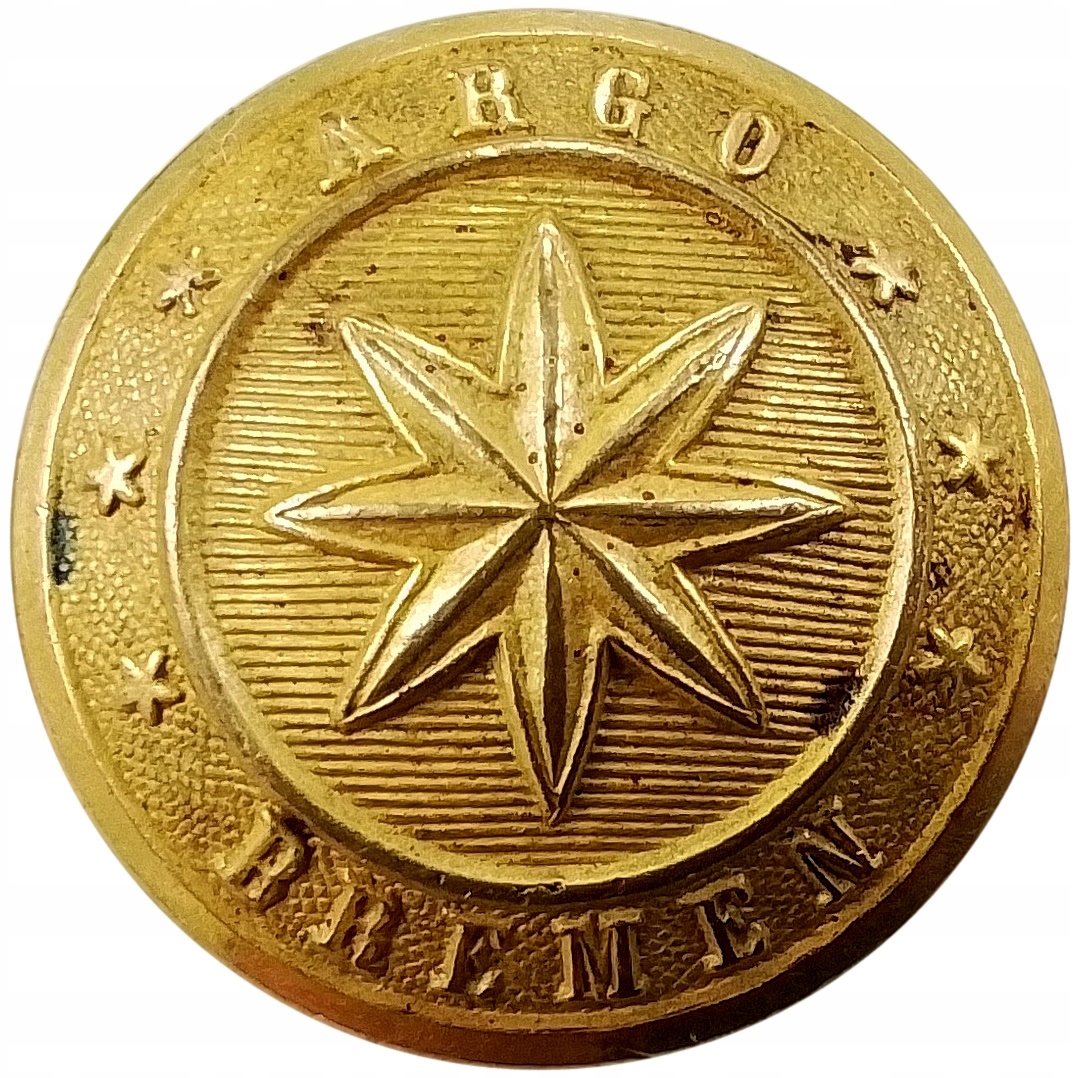 Пуговица на форменной одежде сотрудника судоходной компании Арго из Бремена, компания организовывала круизы в основном в Финляндию, Великобританию и Левант, двухслойная, реверс подписан наименованием производителя, с надписью дополнительная канавка для облегчения проведения иглы, полностью позолоченная.