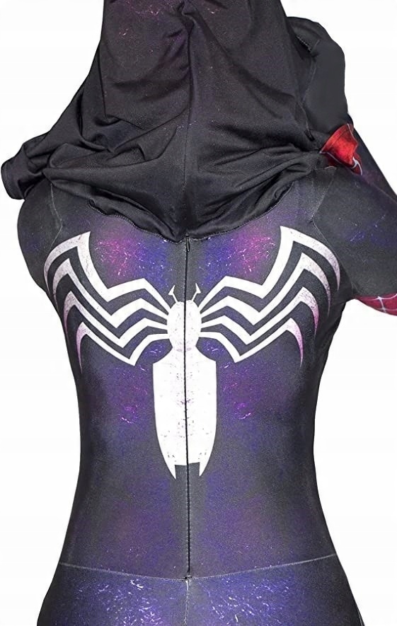 Цельный костюм Гвен Стейси в оттенках черного, красного и фиолетового. Хорошо сшит, слегка эластичен, застегивается на молнию. Благодаря нашему предложению каждый превратится в любимого персонажа комиксов.