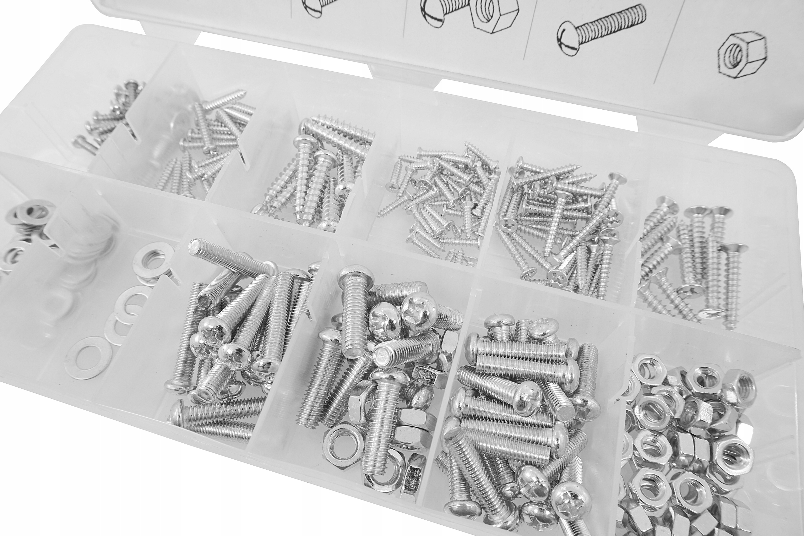 - Разнообразие размеров - В комплект входит широкий размерный ряд болтов, гаек, винтов и шайб, что позволяет адаптировать их к различным применениям и монтажным работам.