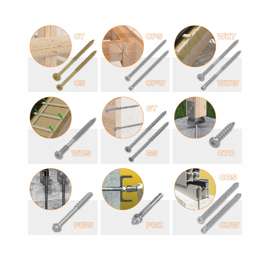 Столярные шурупы, предназначенные для соединения деревянных элементов конструкции. Они не требуют сверления и полностью заменяют строительные гвозди. Они обладают подтягивающим эффектом. Они доступны длиной до 400 мм, а маркировка длины расположена на головке винта, что облегчает работу. Глубокое гнездо TORX обеспечивает лучшую передачу усилия завинчивания и предотвращает выскакивание бит. Столярные шурупы CS идеально подходят для деревянных и столярных работ, каркасных конструкций, прихожих конструкций и т. д.