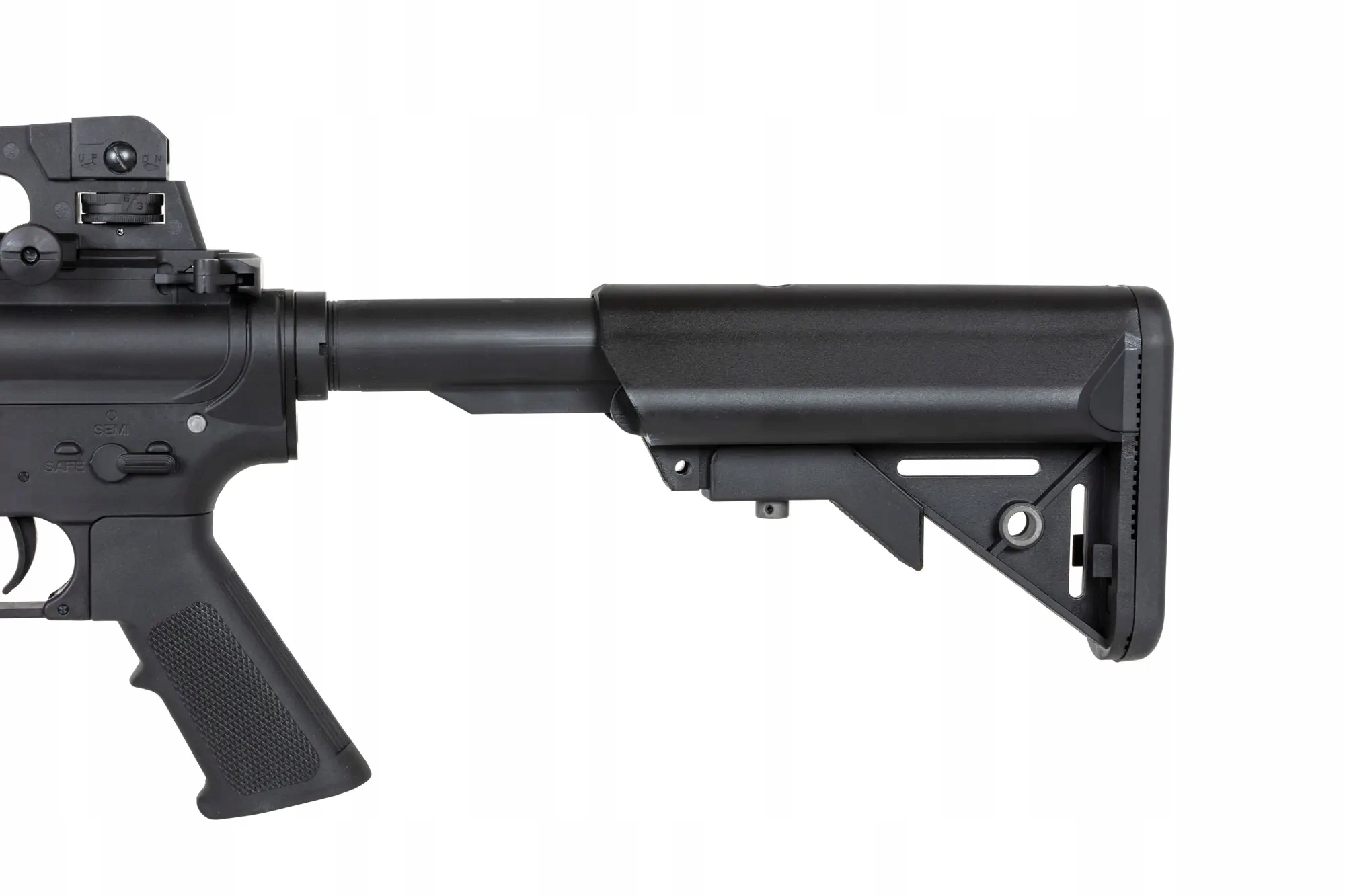 Реплика подогнана очень хорошо, и пользователь не заметит люфта между нижней и верхней частями тела. Использование корпуса и передней панели из легкого материала позволило снизить вес, что сделало его идеальной копией для динамичных игр CQB. Более того, армирование нейлоновым волокном делает конструкцию более прочной, чем другие полимерные конструкции.