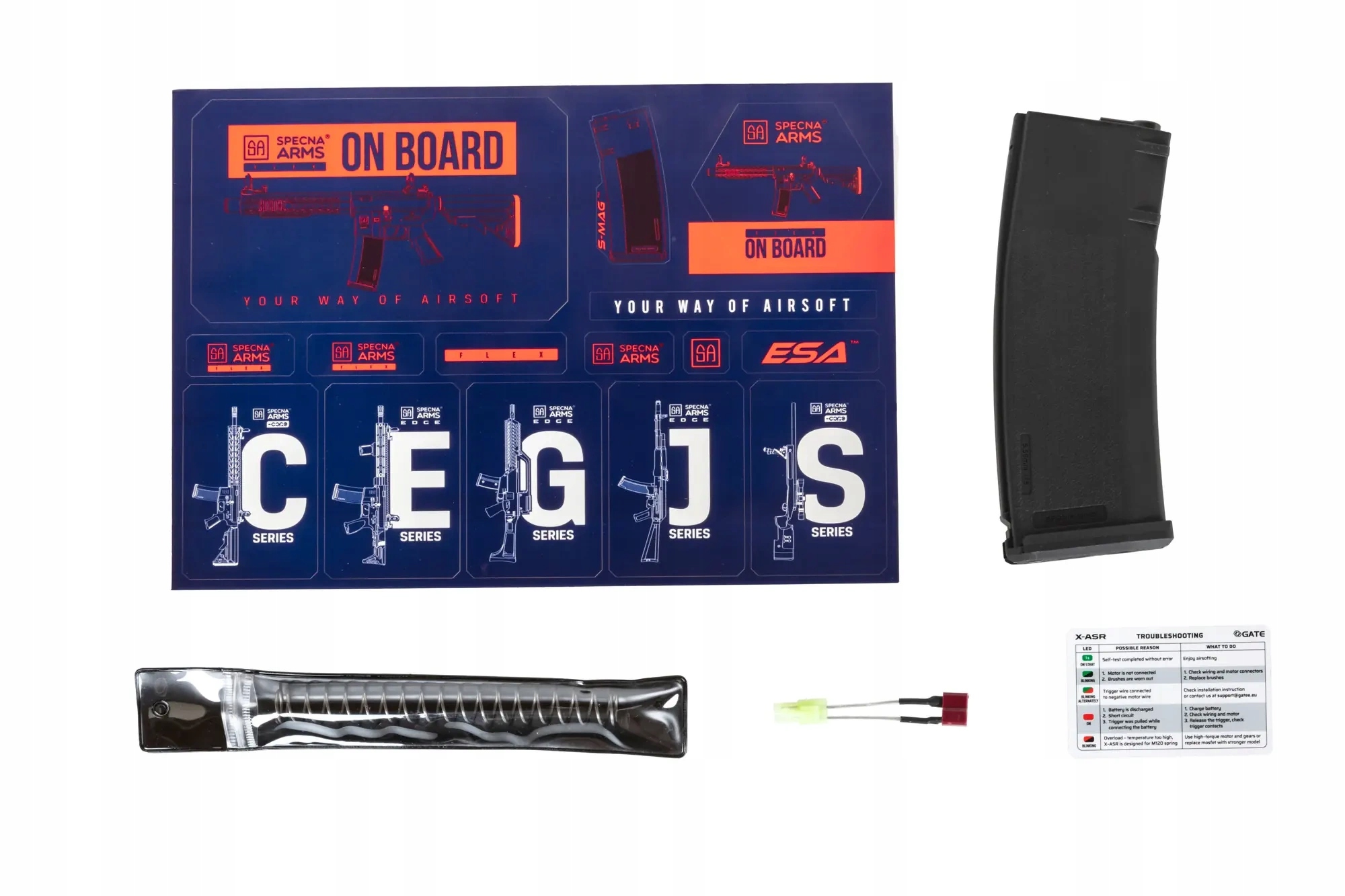 В винтовке с завода установлена система MOSFET X-ASR польского бренда GATE. Это беспрецедентное сотрудничество между польским производителем и известным производителем реплик страйкбола. MOSFET X-ASR высочайшего качества обеспечит безопасность компонентов реплики, улучшит реакцию триггера и срок службы электроники и аккумулятора, а также позволит диагностировать основные неисправности внутри реплики благодаря встроенным сигнальным диодам.