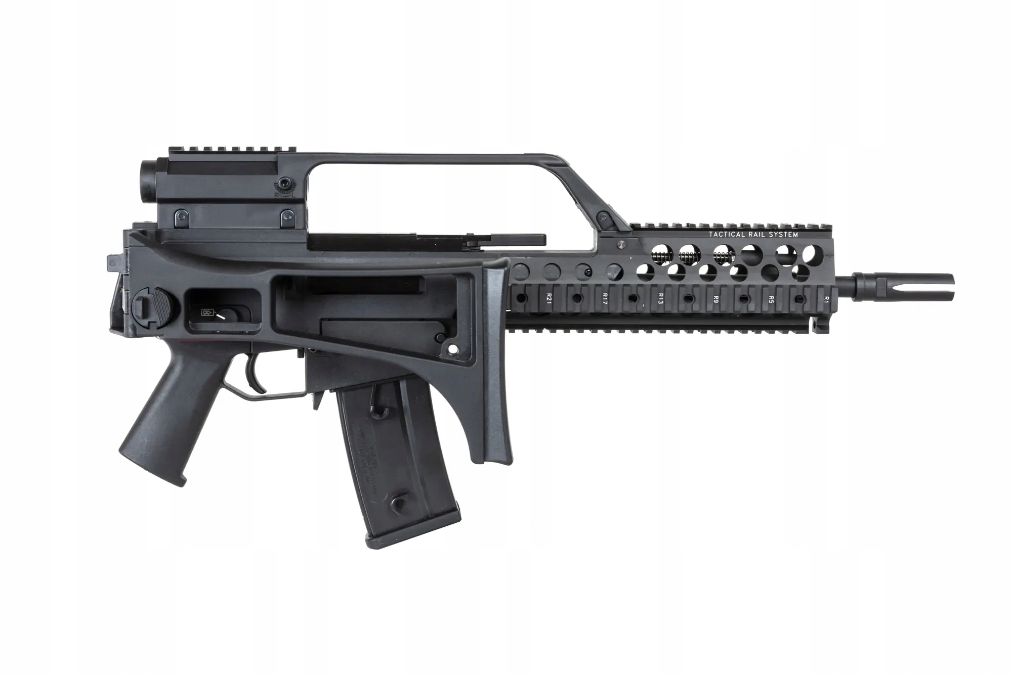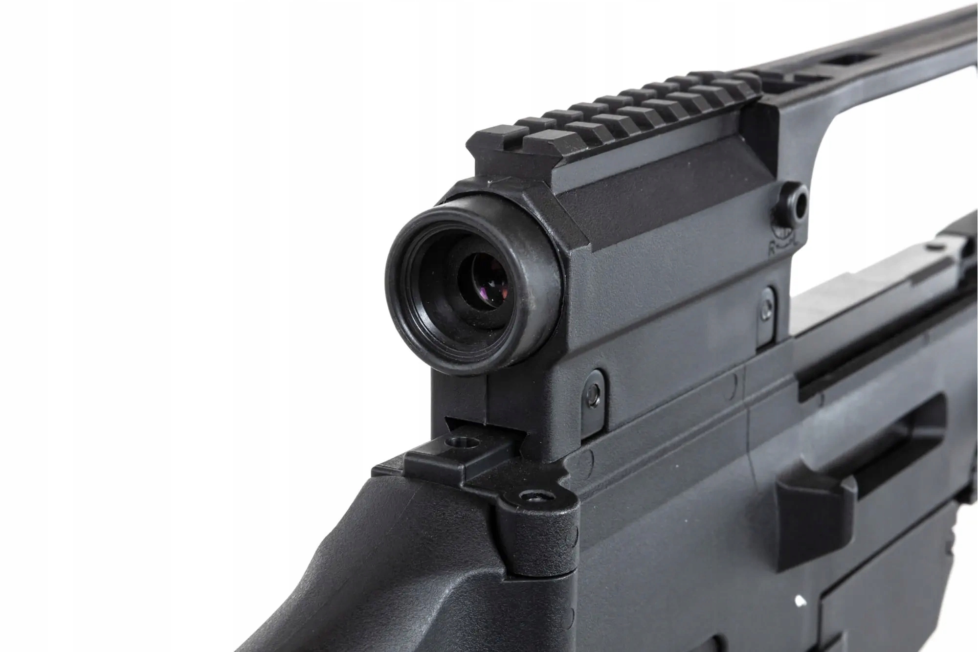 Винтовка ASG SRC DUAL POWER SR36 KSK COB-303, созданная на основе известной конструкции, имеет уже упомянутый прицел, на котором установлена дополнительная RIS-рейка. Еще 4 RIS-рейки, созданные методом ЧПУ, можно найти на цевье винтовки - это позволит установить на изделие вертикальную рукоятку, сошки, лазер, фонарик и т.д. GB-303имеет складной вбок приклад, двусторонний переключатель огня и двустороннюю рукоятку заряжания.